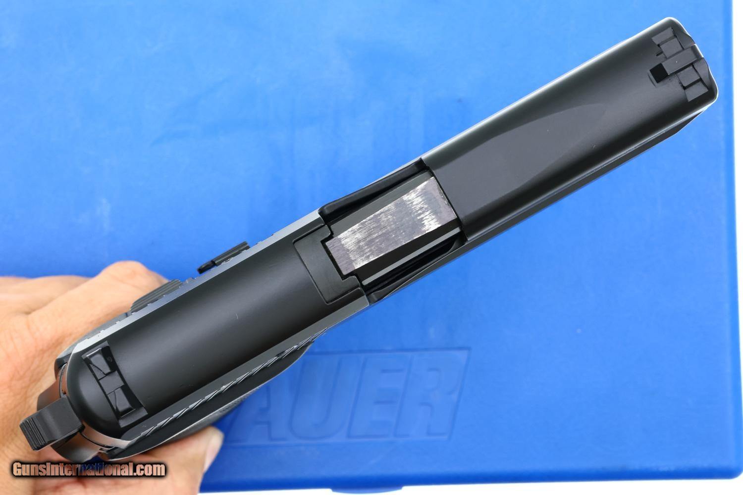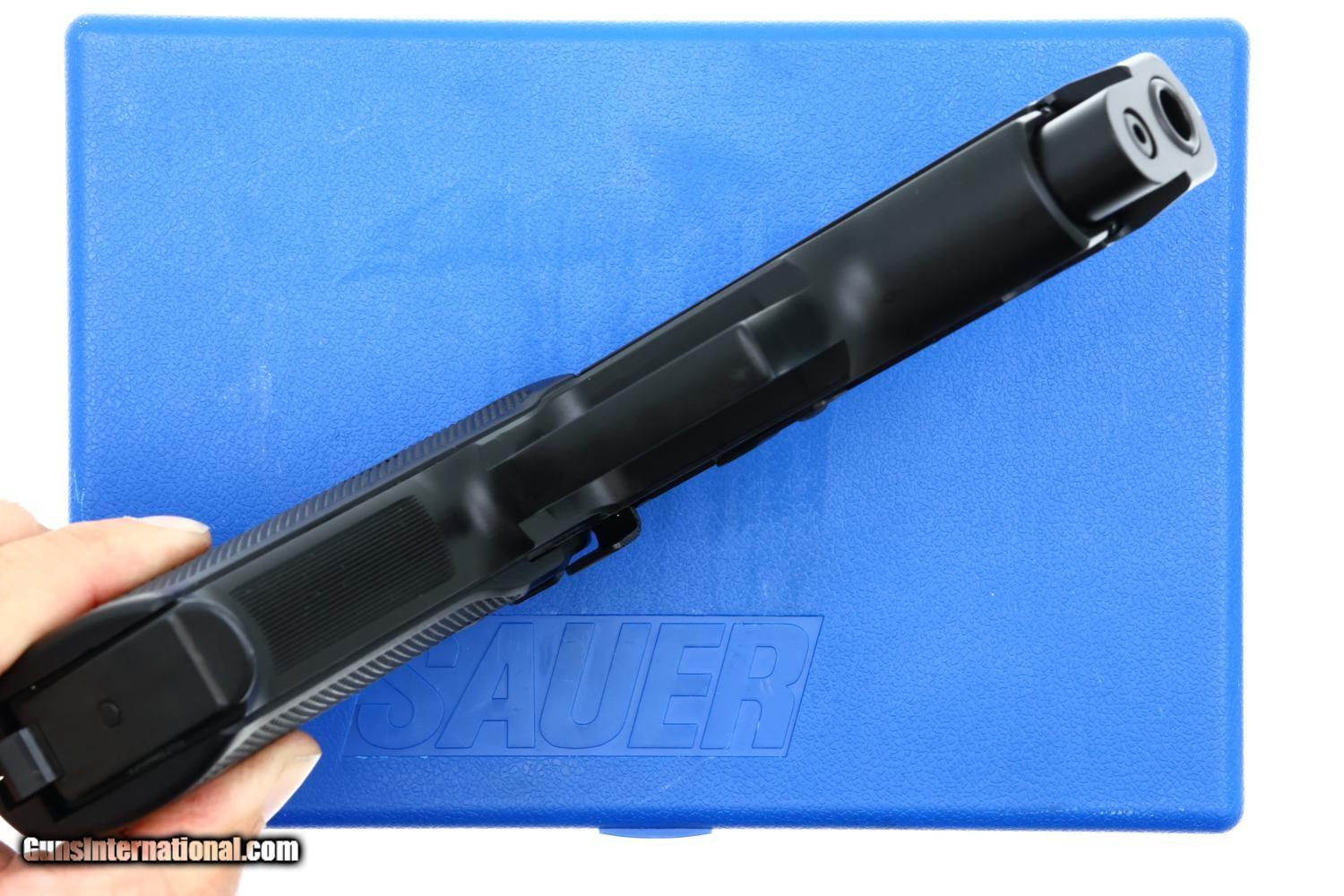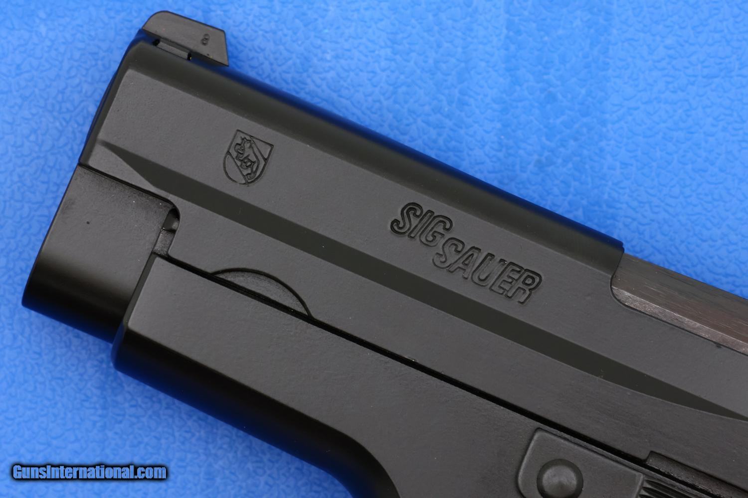 Beautiful SIG SAUER P225 pistol in 9mmP assembled in Switzerland for the Bern Police with drift adjustable front and rear sights. Left side of slide marked with the Bern canton, followed by “SIG SAUER” . The right side is marked with the model surmounting “Montage Suisse” (meaning assembled in Switzerland). The exposed barrel hood is marked 9mm Para along with the Swiss proofing that is repeated on the forward slide. The full serial number is on the right side of the slide, the right side of the frame, and the left side of the barrel hood (not shown). Fitted with two piece black plastic checkered grips. Single column magazine with zippered spine and seven indicator holes. Complete with original blue SIG SAUER shipping box with spare magazine, multi-language instruction booklet and a black leather holster marked with a Bern acceptance mark and the number ‘83’ stamped into the back.