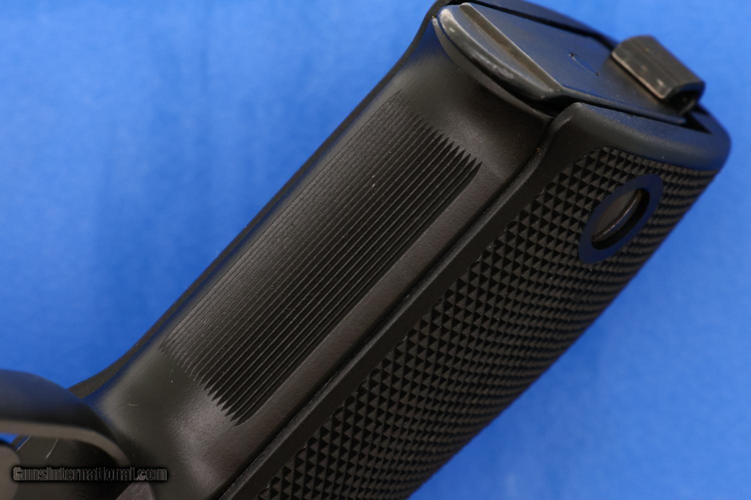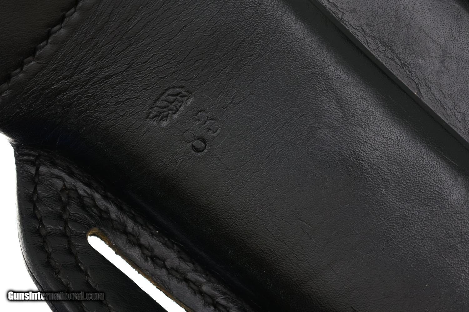 Description: Synopsis: This outstanding SIG Sauer P225 pistol, in 9mmP, assembled in Switzerland for the Bern Police, has drift adjustable sights, a mirror bore, and comes complete with an original box, spare magazine, instruction booklet, and a Bern-accepted leather holster, all in excellent-near new condition. Description: Beautiful SIG SAUER P225 pistol in 9mmP assembled in Switzerland for the Bern Police with drift adjustable front and rear sights. Left side of slide marked with the Bern canton, followed by “SIG SAUER” . The right side is marked with the model surmounting “Montage Suisse” (meaning assembled in Switzerland). The exposed barrel hood is marked 9mm Para along with the Swiss proofing that is repeated on the forward slide. The full serial number is on the right side of the slide, the right side of the frame, and the left side of the barrel hood (not shown). Fitted with two piece black plastic checkered grips. Single column magazine with zippered spine and seven indicator holes. Complete with original blue SIG SAUER shipping box with spare magazine, multi-language instruction booklet and a black leather holster marked with a Bern acceptance mark and the number ‘83’ stamped into the back. Condition: The pistol presents as virtually new with no sharp edge wear or thinning around the muzzle or of the front strap. The cross pin in the slide is slightly bruised on the left side. Grips are as new with securing screws having perfect slots. Excellent primary (slight insertional wear) and spare magazine (nearly new). Mirror bore. Correct manual mechanics. VG box with scattered scuffing, labeled for a closely serial numbered pistol of the same type. Holster is excellent with just a few very superficial scuffs on the outer surface. A fantastic Sig Sauer P225 pistol, assembled in Switzerland for the Swiss police, complete with a correct box, literature, spare magazine, and a Bern-accepted police holster. SOLD Manufacturer: SIG Sauer Model: P225 Serial Number: M417489 Caliber Info: 9mmP Condition: EXC |
