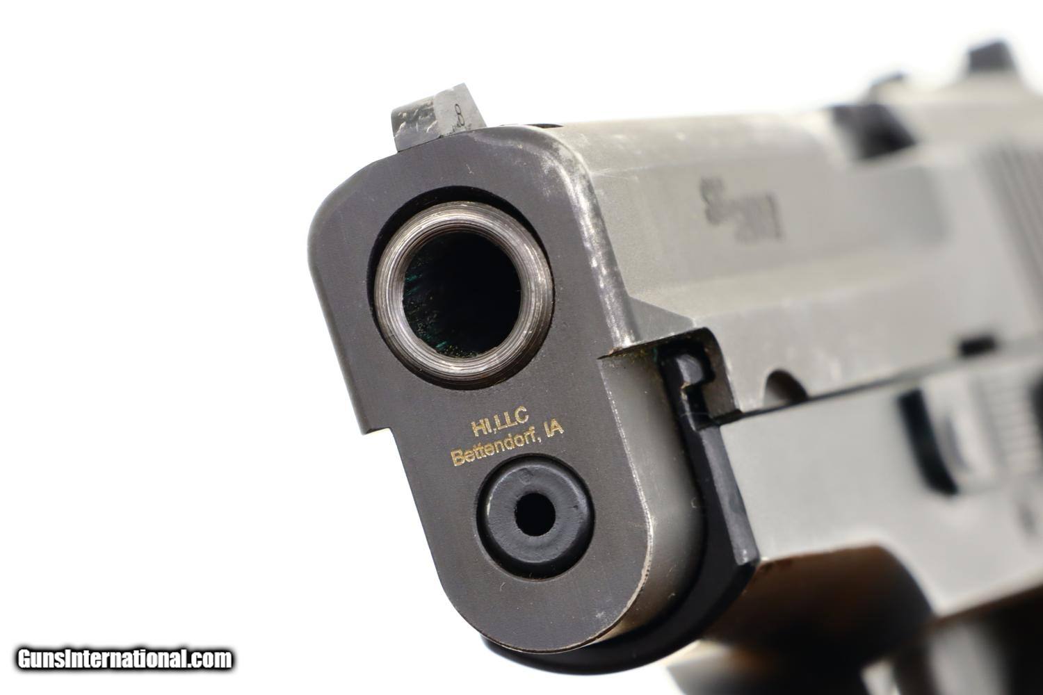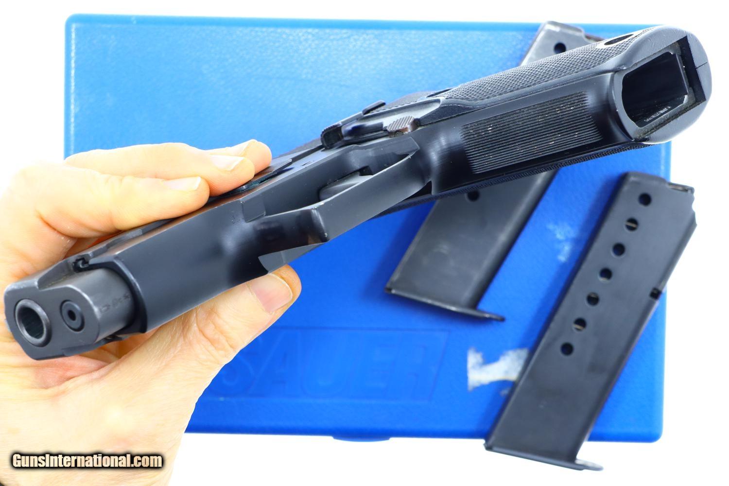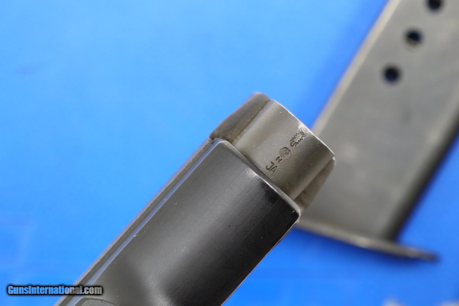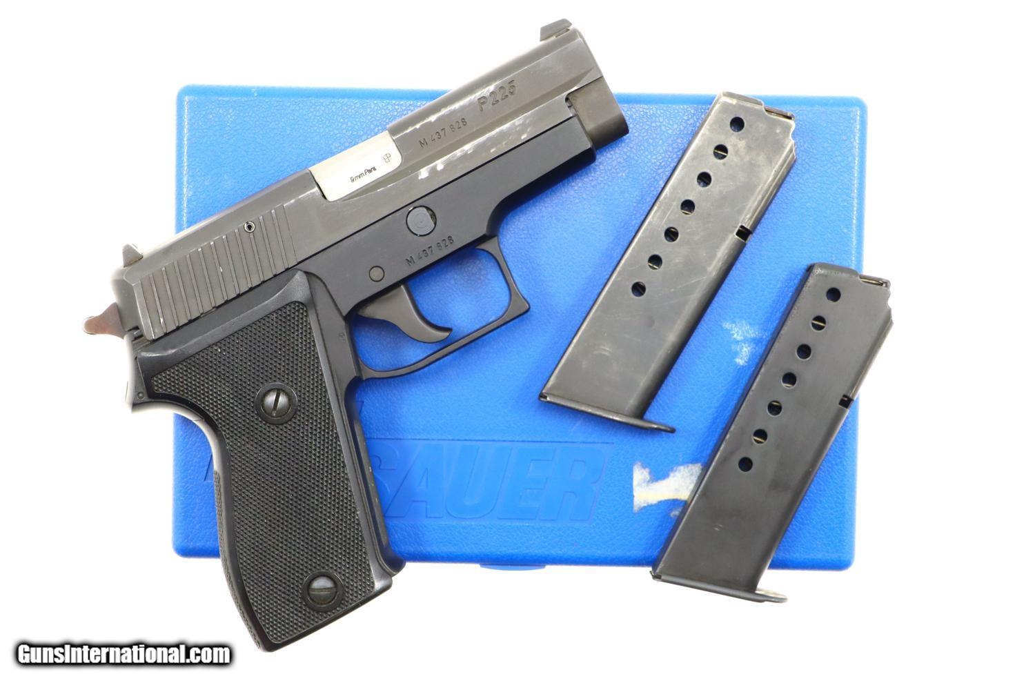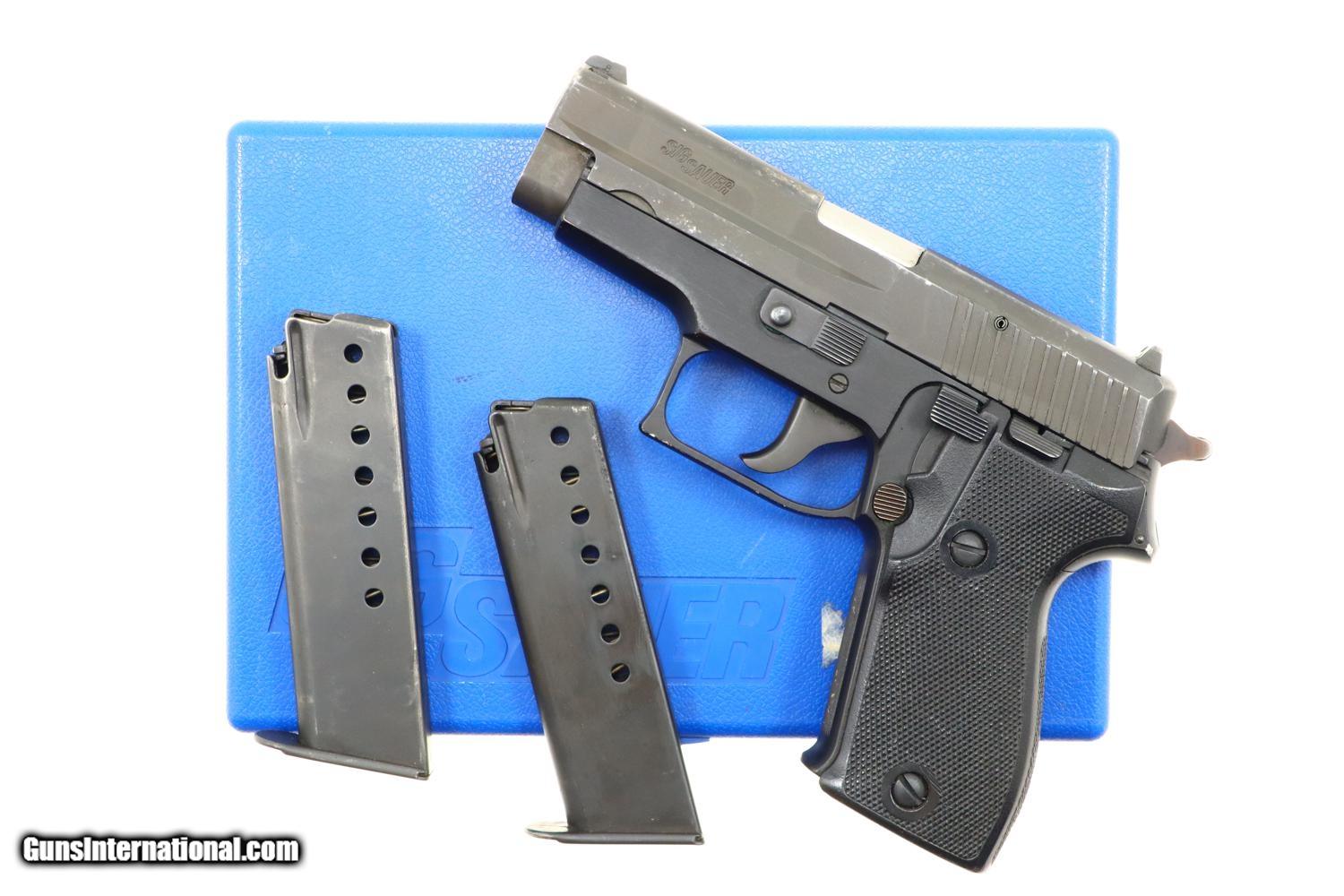 Description: Standard configuration SIG Sauer P225 with fixed front and drift adjustable rear sight. SIG Sauer marking on left side of slide. Right side marked with the model and full serial number that is repeated on the barrel hood and the right side of the frame. “JA” marking under slide reflects proofing in 1980. Complete with spare magazine and a correct shipping box that was later numbered to the pistol. Synopsis: Classic SIG Sauer P225 in 9mmP, made in Germany, 1980, with spare magazine in correct shipping box. Condition: VG+ original finish with comparable condition grips and magazines. Bright bore with sharp rifling. Perfect manual mechanics. Box with storage wear and replaced labeling. ~~Insured shipping fee of $45; most packages shipped using FedEx 2nd Day.~~ SOLD Manufacturer: SIG Sauer Serial Number: M437828 Caliber Info: 9mmP |