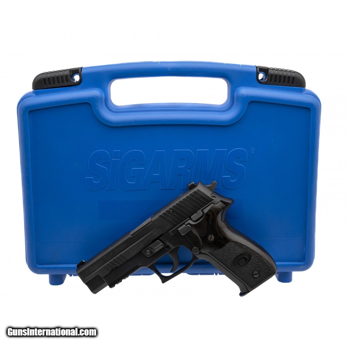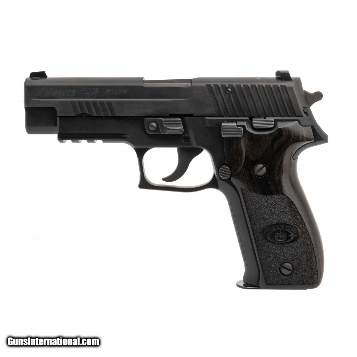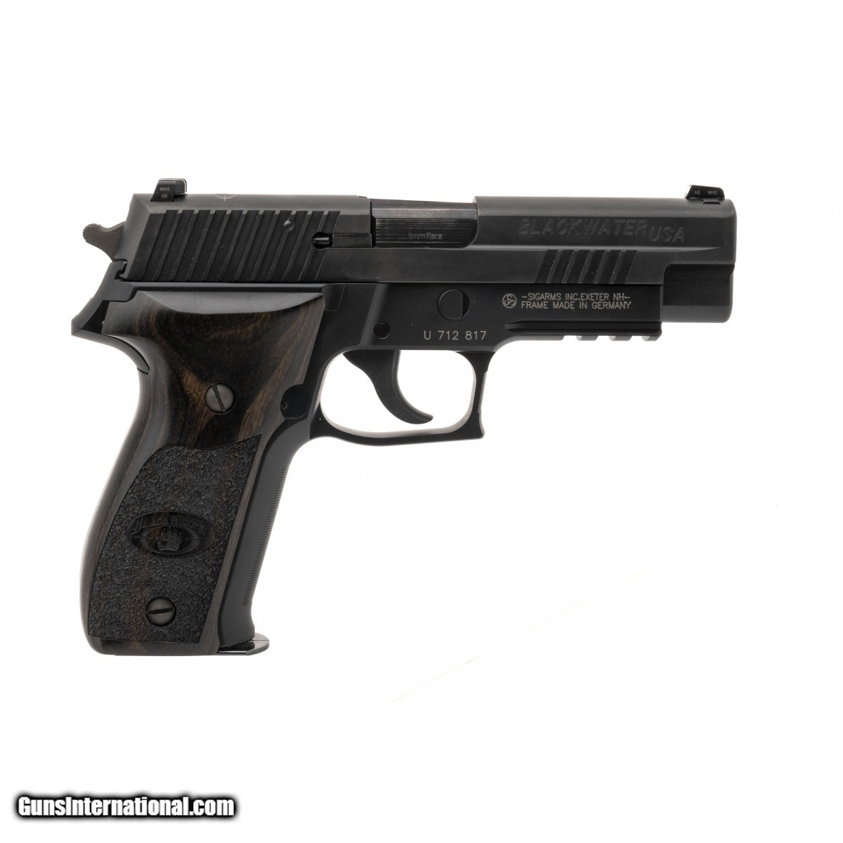 SN: U712817. Semi-automatic handgun made by Sig in the late 2000s for the Blackwater USA private military contractor. 4.25"" barrel chambered for 9x19mm. Excellent condition. Features Blackwater branding on the slide and custom dark wood grips, SigLite night sights and black nitride finish. Comes with original box and four extra magazines.