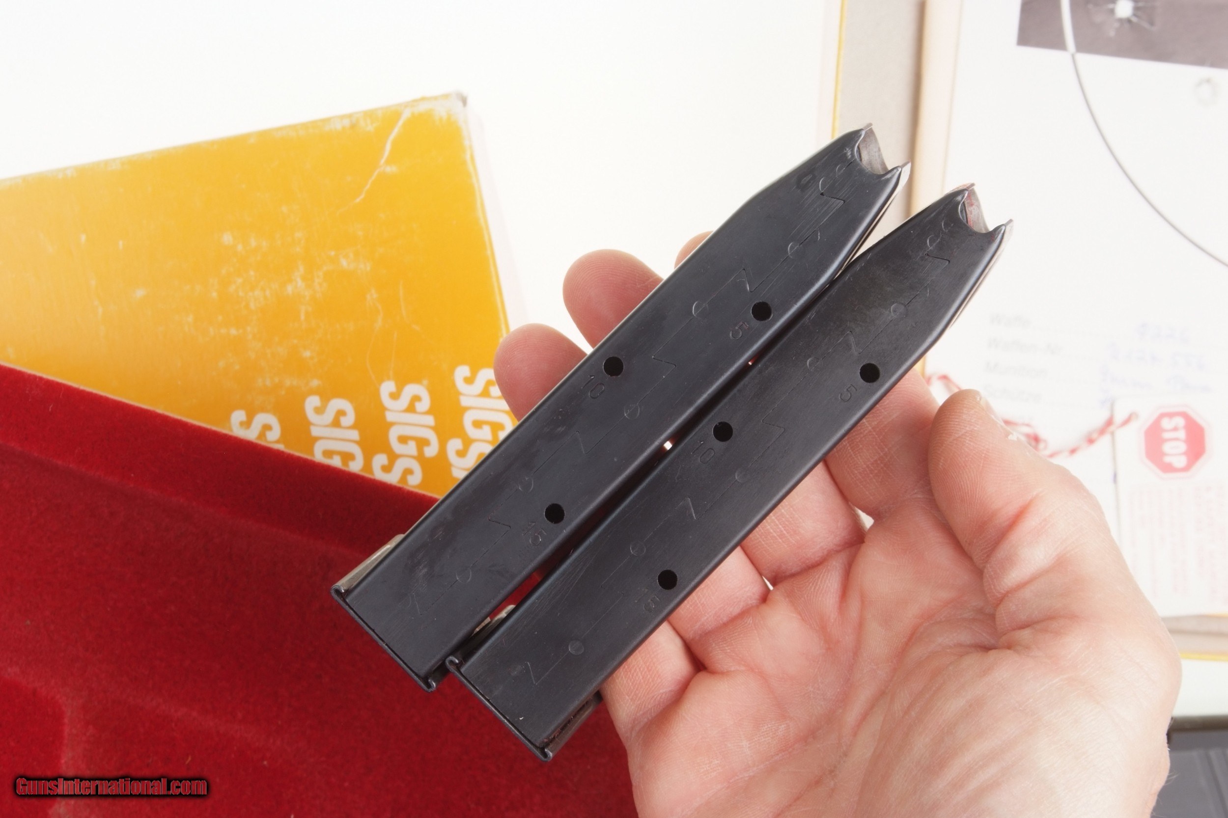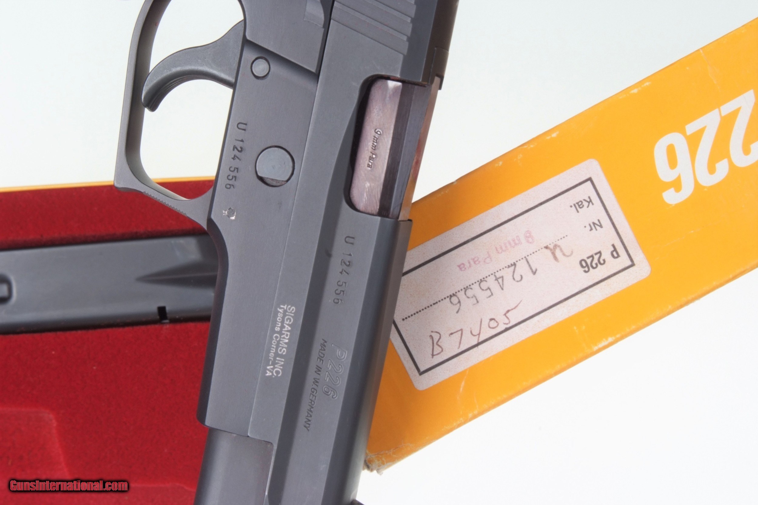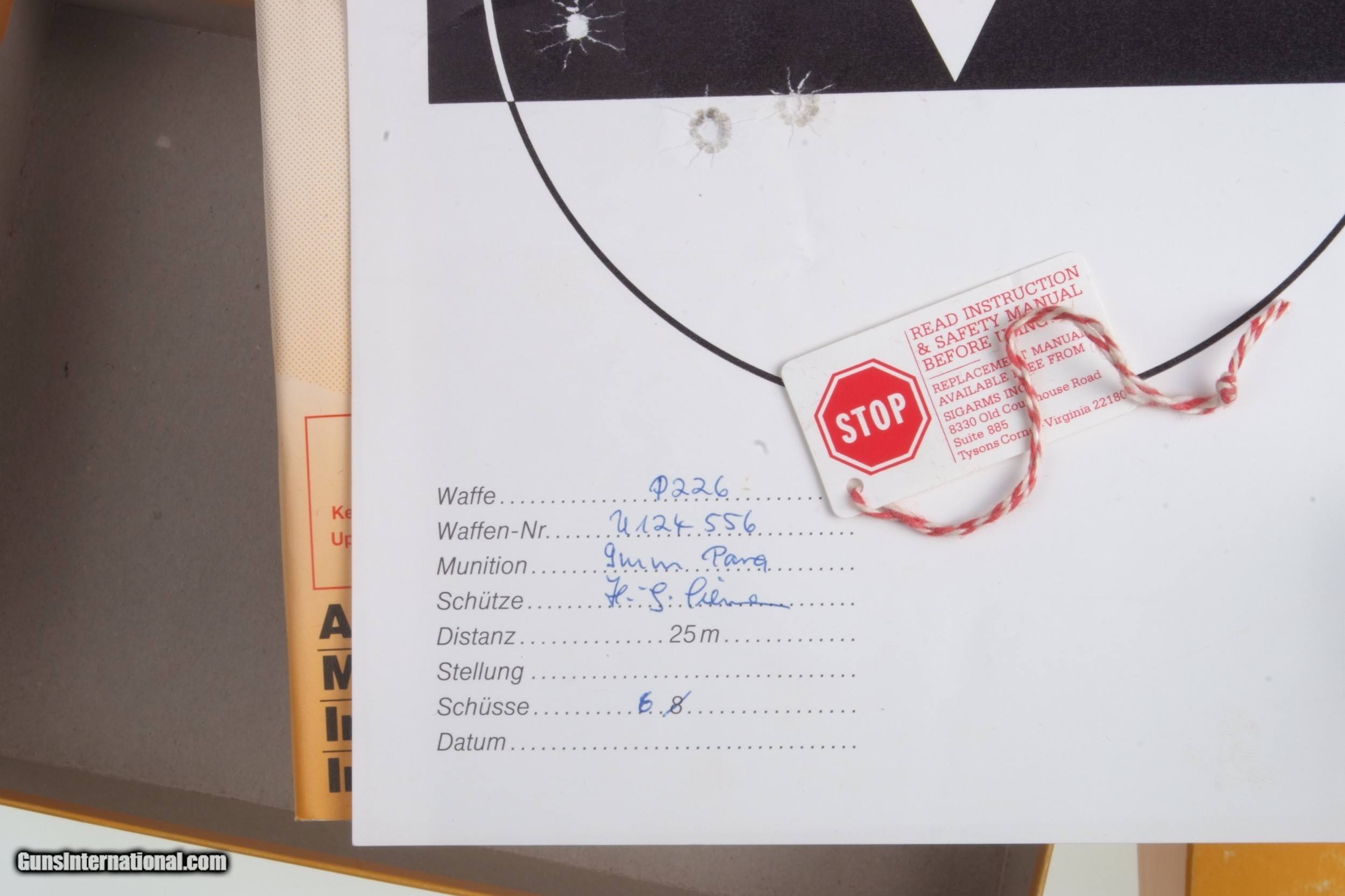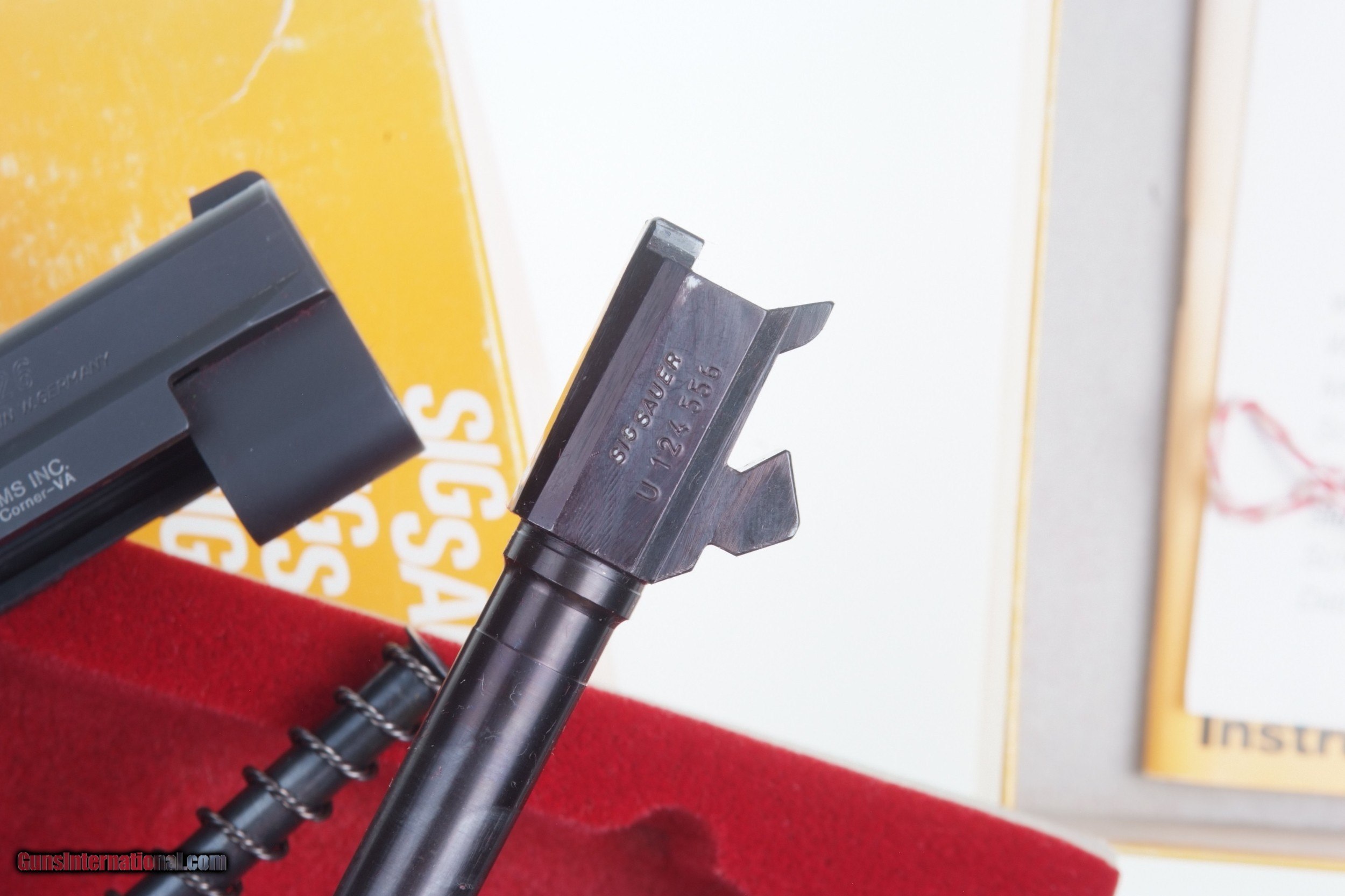 Description: SIG Sauer P226 with night sights, early Tyson’s Corner import, and instruction booklet, spare magazine, test target, and original matching shipping box. SN: U124556. Cal: 9mmP. Standard configuration P226 whose left slide is manufacturer marked “SIG SAUER”. Right side of slide marked with model and serial number along with “MADE IN W. GERMANY” and the SIGARMS INC./Tyson’s Corner import marking. Right side of barrel hood is marked with caliber. Disassembly shows a matching serial number on the left side adjacent to “SIG SAUER”. The full SN is repeated on the right side of the frame, just above the trigger guard. Fitted with unmarked checkered plastic grips. Primary and spare magazine were both made by SIG with a zippered spine and three indicator holes number “5, 10, 15”. Crisp instruction booklet and numbered but not dated test target. Complete with original orange shipping box with matching end label, one of the corners having separated. Condition: Excellent original condition with very minor sharp edge wear and a few very superficial scuffs on the top of the slide. Front strap markings as photographed, likely from ringed finger. Comparable condition magazines showing very light use. Crisp literature and VG+ shipping box. A very nice and relatively early SIG P226, equally at home in a collection and on the range. A HISTORIC INVESTMENT! $895.00 SOLD Model: P226 |