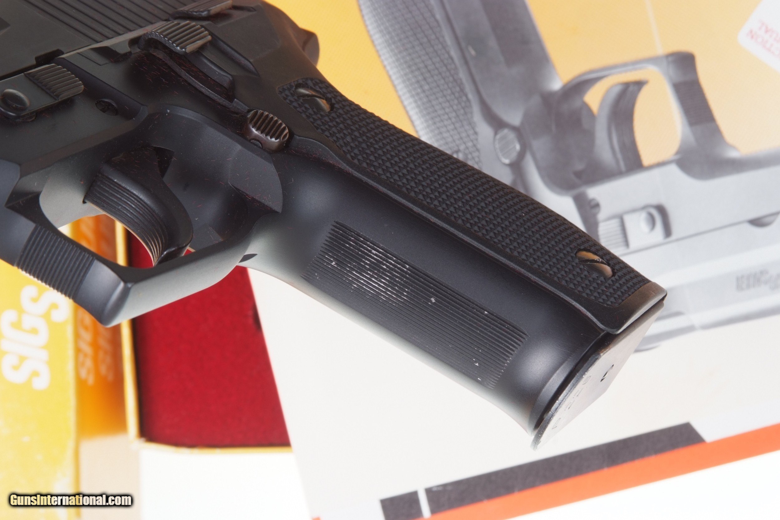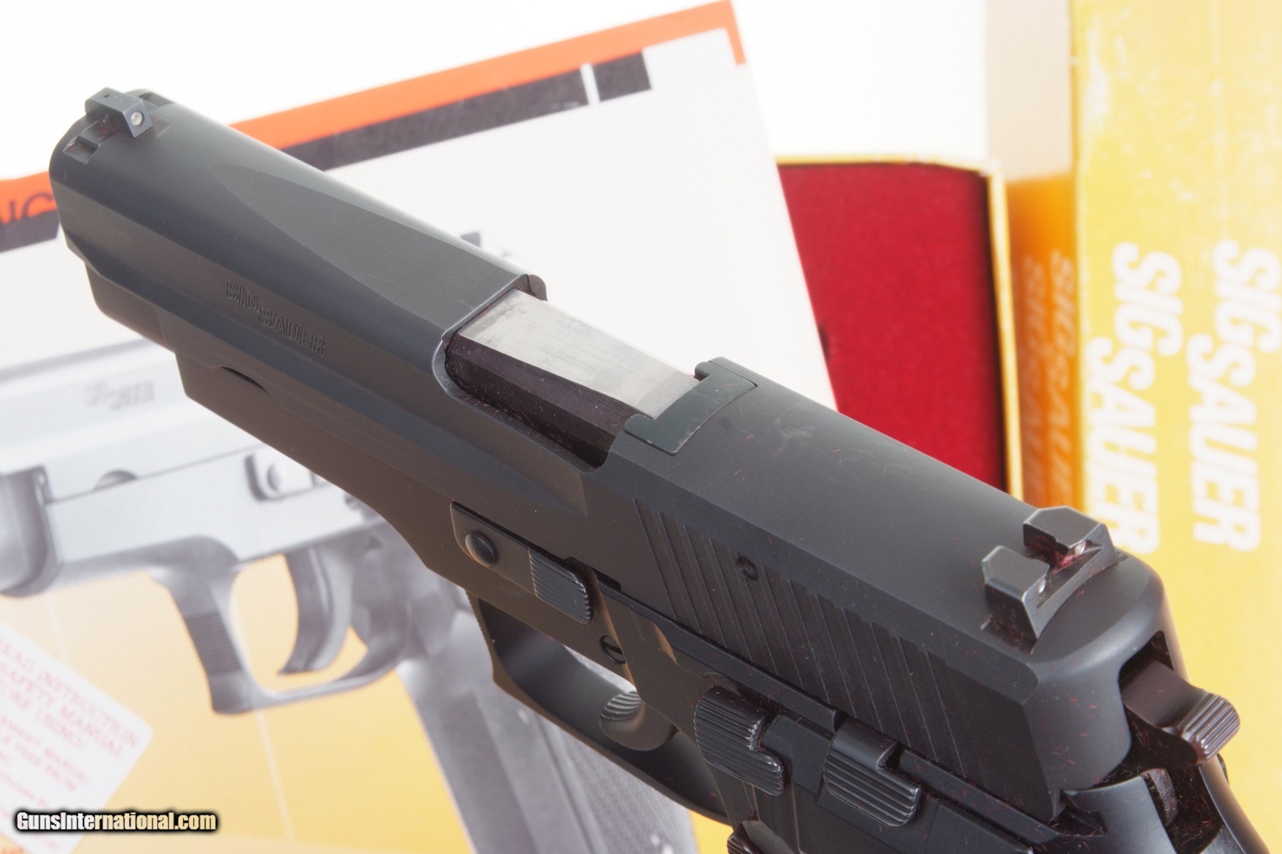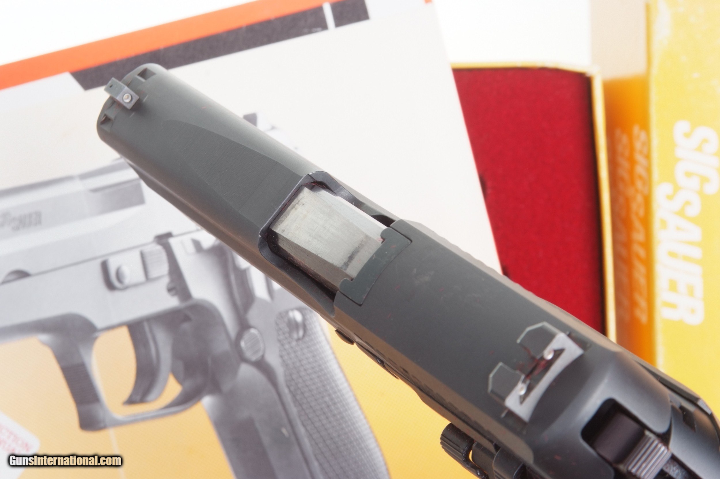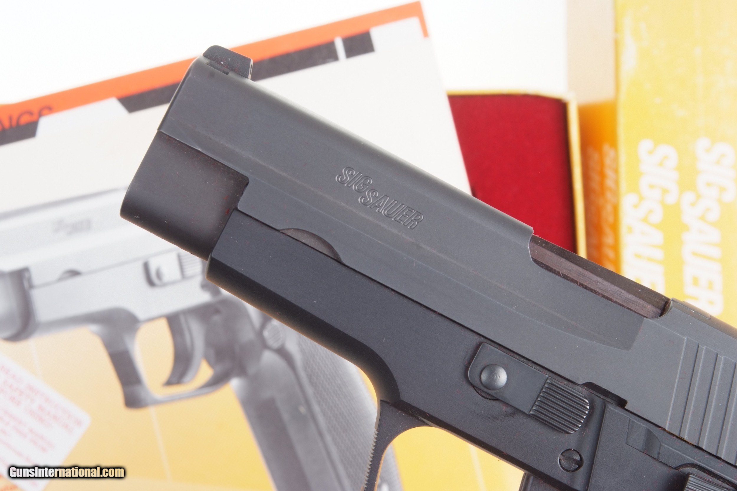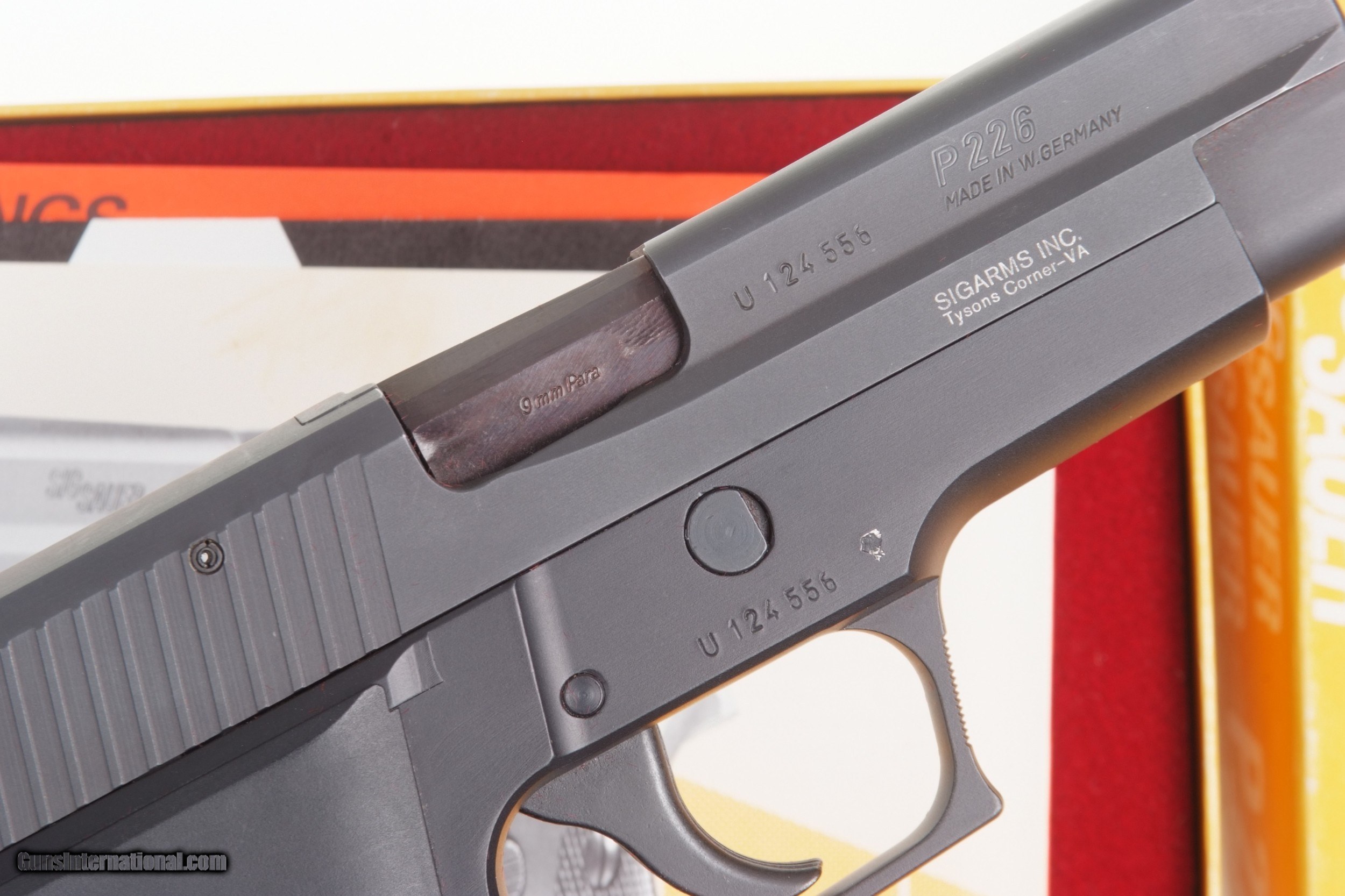 Description: SIG Sauer P226 with night sights, early Tyson’s Corner import, and instruction booklet, spare magazine, test target, and original matching shipping box. SN: U124556. Cal: 9mmP. Standard configuration P226 whose left slide is manufacturer marked “SIG SAUER”. Right side of slide marked with model and serial number along with “MADE IN W. GERMANY” and the SIGARMS INC./Tyson’s Corner import marking. Right side of barrel hood is marked with caliber. Disassembly shows a matching serial number on the left side adjacent to “SIG SAUER”. The full SN is repeated on the right side of the frame, just above the trigger guard. Fitted with unmarked checkered plastic grips. Primary and spare magazine were both made by SIG with a zippered spine and three indicator holes number “5, 10, 15”. Crisp instruction booklet and numbered but not dated test target. Complete with original orange shipping box with matching end label, one of the corners having separated. Condition: Excellent original condition with very minor sharp edge wear and a few very superficial scuffs on the top of the slide. Front strap markings as photographed, likely from ringed finger. Comparable condition magazines showing very light use. Crisp literature and VG+ shipping box. A very nice and relatively early SIG P226, equally at home in a collection and on the range. A HISTORIC INVESTMENT! $895.00 SOLD Model: P226 |