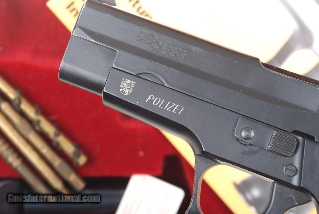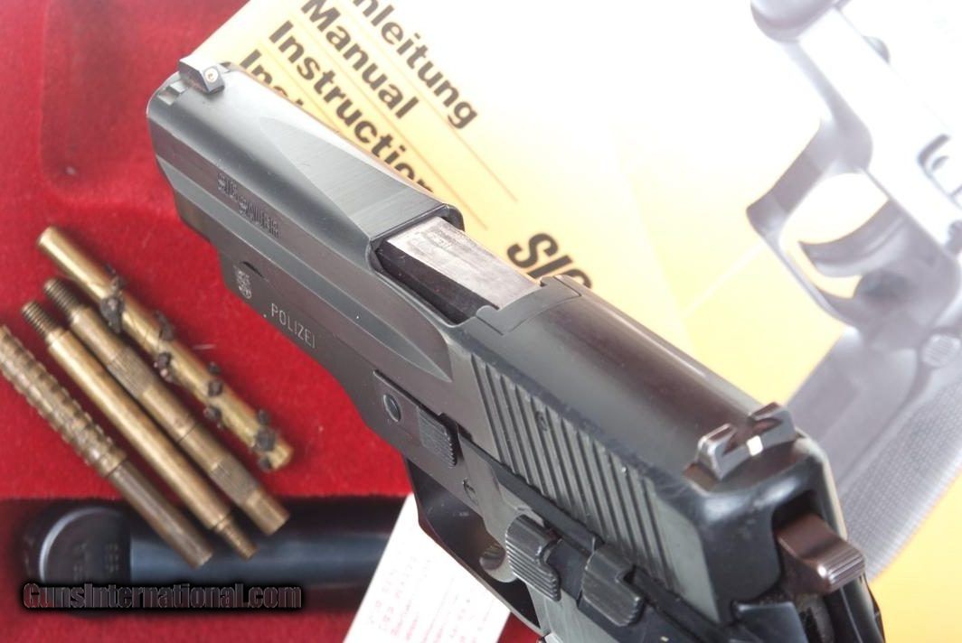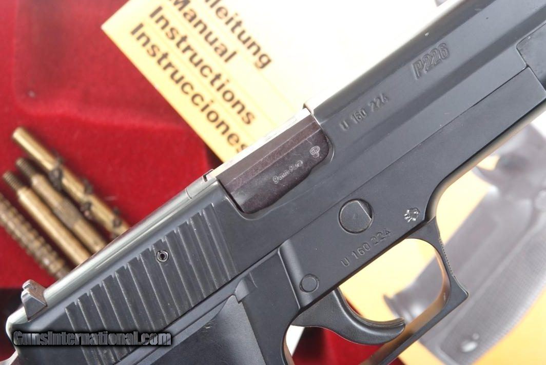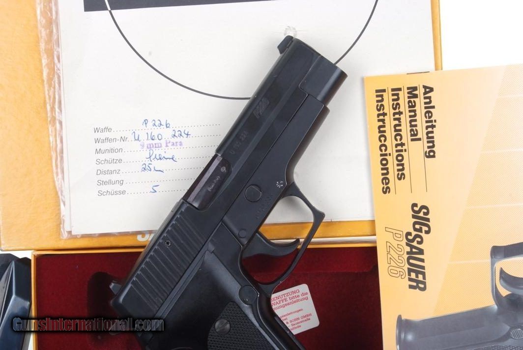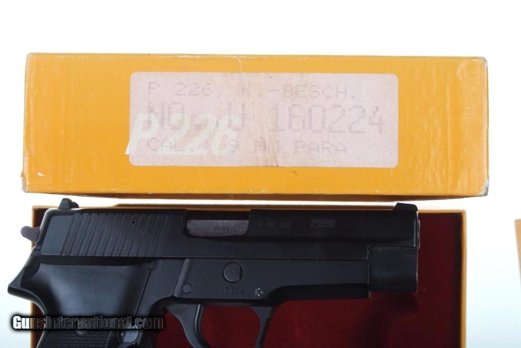 Description: Standard configuration P226, with nitron finished slide and white highlighted sights, made for the Thurgau Police. Left side slide is marked “SIG SAUER". Thurgau Canton emblem on left side of frame followed by “POLIZEI”. Right side of slide marked with model and serial number. Right side of matching barrel is marked with the caliber. The full serial number repeated for the third time, on the right side of the frame. Fitted with SIG Sauer grips with unmarked checkered surfaces. Magazine made by MEC-GAR, in Italy on behalf of SIG Sauer, as marked on the left side. Right side of the magazine with three indicator holes numbered “5, 10, 15 ”. Complete with military cleaning kit dated 1958, matching test target, instuction booklet, and original matching shipping box. Synopsis: SIG Sauer P226, Swiss, Thurgau Police, Matching Target, Box. Condition: Near excellent original condition with sharp edge wear and a few superficial scuffs as one might expect from a police service pistol. A few small marks on frontstrap as photographed. Comparable condition grips and magazine. Bright bore with sharp rifling. Perfect manual mechanics. Excellent test target and instruction booklet. Box intact, scattered discolorations on lid, excellent liner. An attractive SIG P226, made and marked for the Thurgau Police, equally at home in a collection and on the range. ~~Insured shipping fee of $55; most packages shipped using FedEx 2nd Day.~~ SOLD Manufacturer: SIG Sauer Serial Number: U160224 Caliber Info: 9mmP |