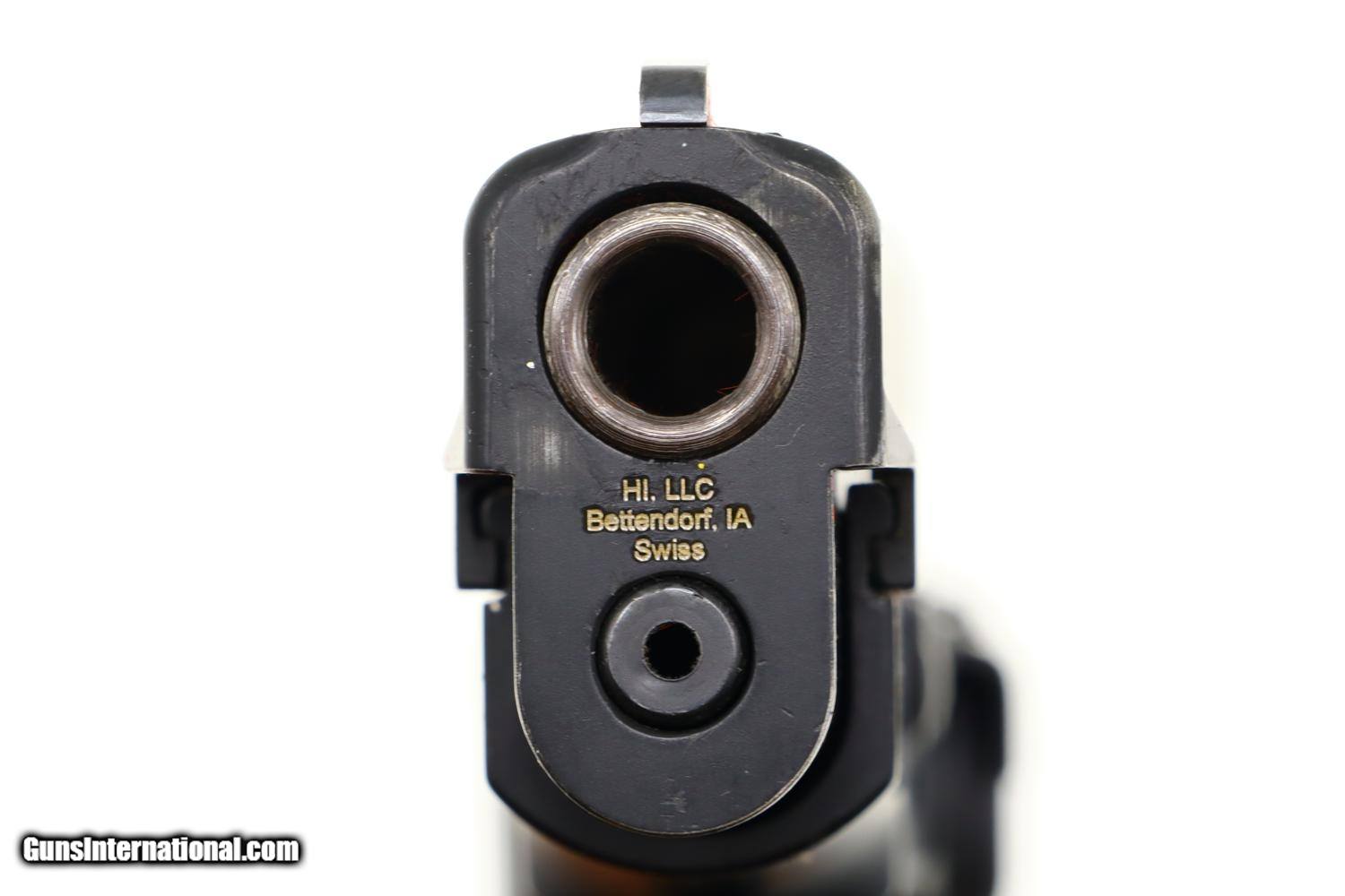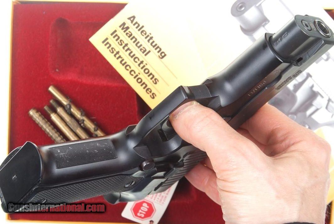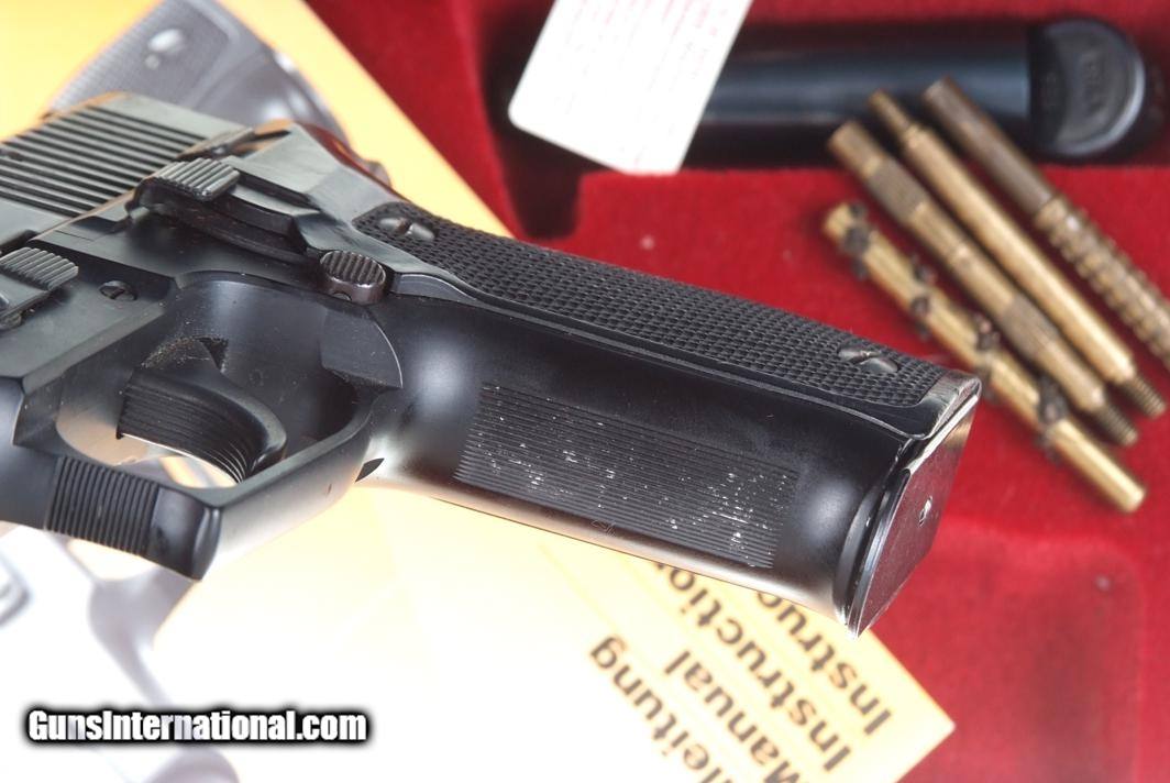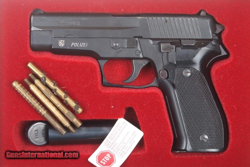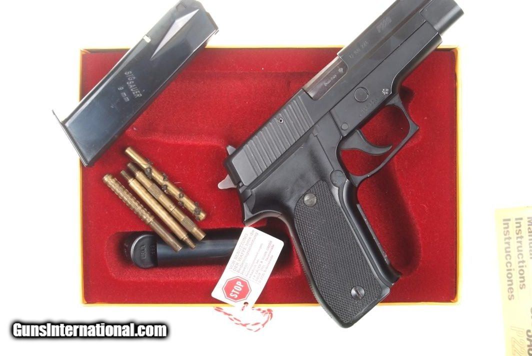 Description: Standard configuration P226, with nitron finished slide and white highlighted sights, made for the Thurgau Police. Left side slide is marked “SIG SAUER". Thurgau Canton emblem on left side of frame followed by “POLIZEI”. Right side of slide marked with model and serial number. Right side of matching barrel is marked with the caliber. The full serial number repeated for the third time, on the right side of the frame. Fitted with SIG Sauer grips with unmarked checkered surfaces. Magazine made by MEC-GAR, in Italy on behalf of SIG Sauer, as marked on the left side. Right side of the magazine with three indicator holes numbered “5, 10, 15 ”. Complete with military cleaning kit dated 1958, matching test target, instuction booklet, and original matching shipping box. Synopsis: SIG Sauer P226, Swiss, Thurgau Police, Matching Target, Box. Condition: Near excellent original condition with sharp edge wear and a few superficial scuffs as one might expect from a police service pistol. A few small marks on frontstrap as photographed. Comparable condition grips and magazine. Bright bore with sharp rifling. Perfect manual mechanics. Excellent test target and instruction booklet. Box intact, scattered discolorations on lid, excellent liner. An attractive SIG P226, made and marked for the Thurgau Police, equally at home in a collection and on the range. ~~Insured shipping fee of $55; most packages shipped using FedEx 2nd Day.~~ SOLD Manufacturer: SIG Sauer Serial Number: U160224 Caliber Info: 9mmP |