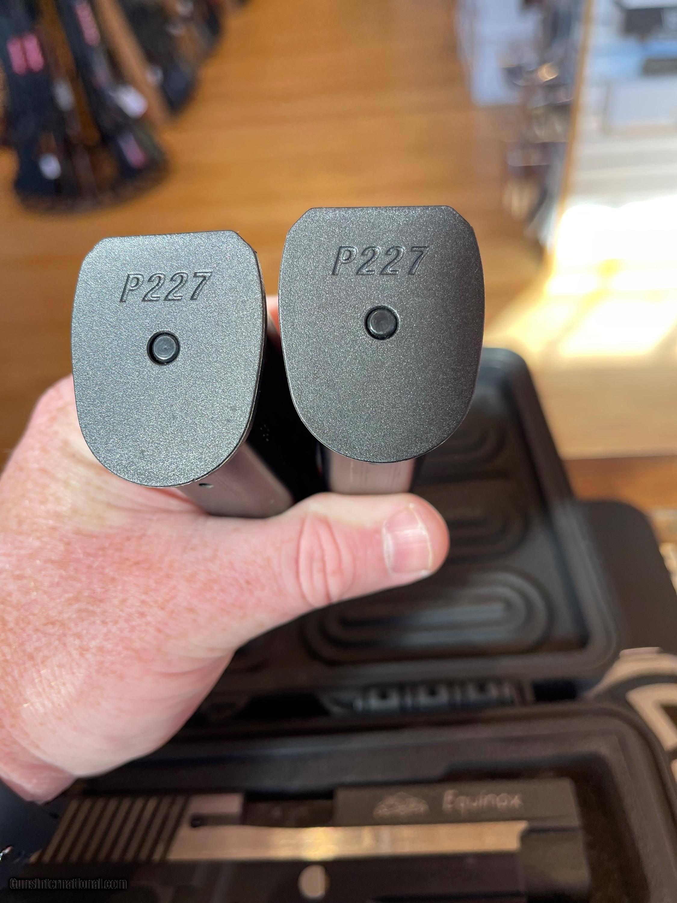 Description: Almost as new in the box as you can get. Well taken care, Gently Used Sig P227 Equinox 45ACP. Do not miss out on this one. NO OUT OF STATE TAXES OR CC FEES. Sig Sauer added another P227 .45 ACP option called the Equinox. This almost new P227 comes with a 2-tone slide with a nickel/pewter appearance. The Equinox also comes with a polished trigger, hammer, and control levers for those who like their handguns to be more expressive. The combination of the 2-tone slide and polished controls provides a nice contrast for visual effect. The P227 Equinox 2-tone slide is designed for contrast, along with the highly polished hammer, trigger, and control levers. The Sig Sauer P227 Equinox .45ACP is a design from the SIG SAUER Custom Shop master gunsmiths, and appears to be marketed towards shooters who want their handguns to stand out. The two-tone slide is actually accented Nitron® stainless steel, with brush polished flats and nickel accents. That custom work partially reflects light to add to the contrasting colors and effect. Sitting atop a lightweight black, hard-anodized alloy frame, the Equinox does have an attractive appearance that still portrays a serious side. The P227 takes the classic contrast of black and grey colors to a more elegant level. The hard anodized black frame adds to the contrast, but the comfortable ergonomic draws the shooter in. The Sig master gunsmiths also combined a TRUGLO® Tritium Fiber Optic front sight with the already proven SIGLITE® rear night sight. The combination provides a great contrast that allows for excellent target acquisition, whether shooting day or night. The TRUGLO fiber optic front sight contrasts the rear SIGLITE improving target acquisition. If a shooter wishes to further enhance their low-light use, the P227 Equinox comes equipped with an accessory rail for adding pistol-mounted lights or lasers. The Picatinny rail provides for other lighting options. The P227 Equinox maintains the original P227 DA/SA hammer fired action, and Sig’s famous ergonomic grip. The Equinox will come with standard 10-round magazines, but 14-round extended magazines will also be available. The P227 Equinox will fit most holsters designed for P220R and P226R. SOLD Handgun Caliber: .45 ACP (.45 Auto) |