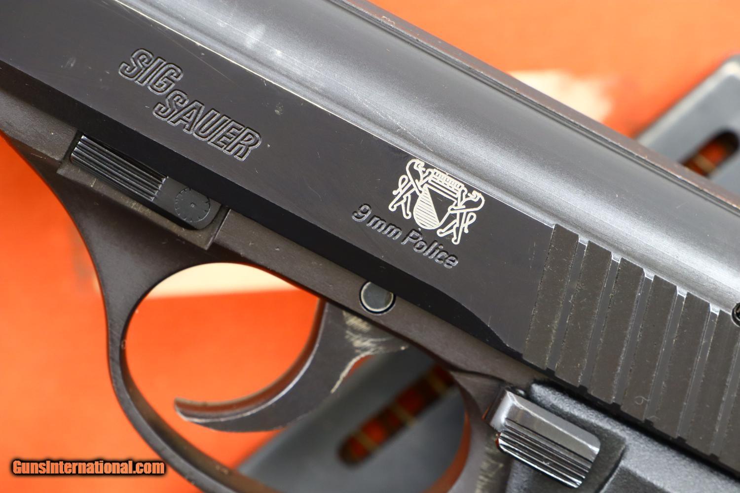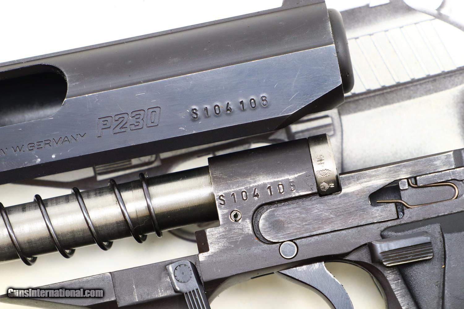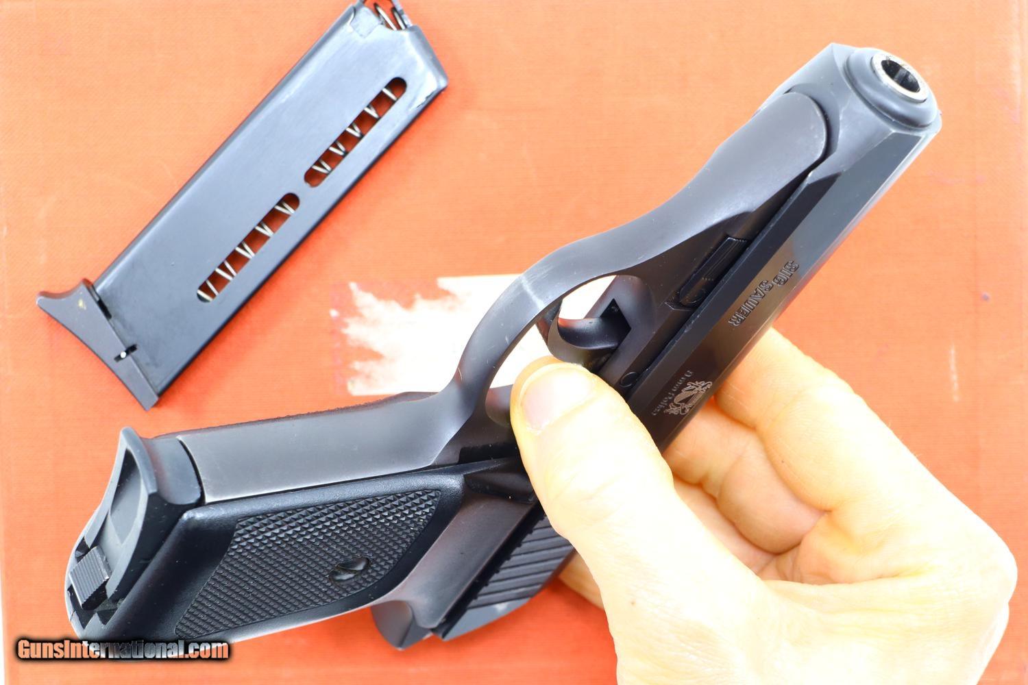 Description: Standard configuration SIG Sauer P230 with fixed front sight and drift adjustable rear sight, with usual white paint highlighting. Left side of slide marked for manufacturer and caliber 9mm Police (not interchangeable with .380 ACP). Bold Zurich Canton logo. Right side of slide marked with the model and serial number that is repeated on the inside of the frame. Black plastic grips, left panel with shallow finger rest, molded checkering around the grip screws. Unmarked finger extension magazines, each side with two vertical indicator slots. Complete with original reddish-orange box, white lettering, top of box with partially removed serial number “107770”, end label with correct serial number. Original booklet. Synopsis: SIG Sauer P230 pistol, caliber 9mm Police, this example marked for Zurich Police, boxed with booklet and spare magazine. Condition: VG+ as one might expect from a carried/holstered police pistol. Comparable condition grips. Mirror bright bore. Perfect manual mechanics. Box with scuffs, grey foam lining removed from base. VG/EXC booklet. ~~Insured shipping fee of $45; most packages shipped using FedEx 2nd Day.~~ SOLD Manufacturer: SIG Sauer Serial Number: S104106 Caliber Info: 9mm Police |