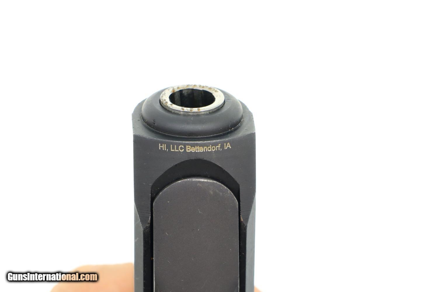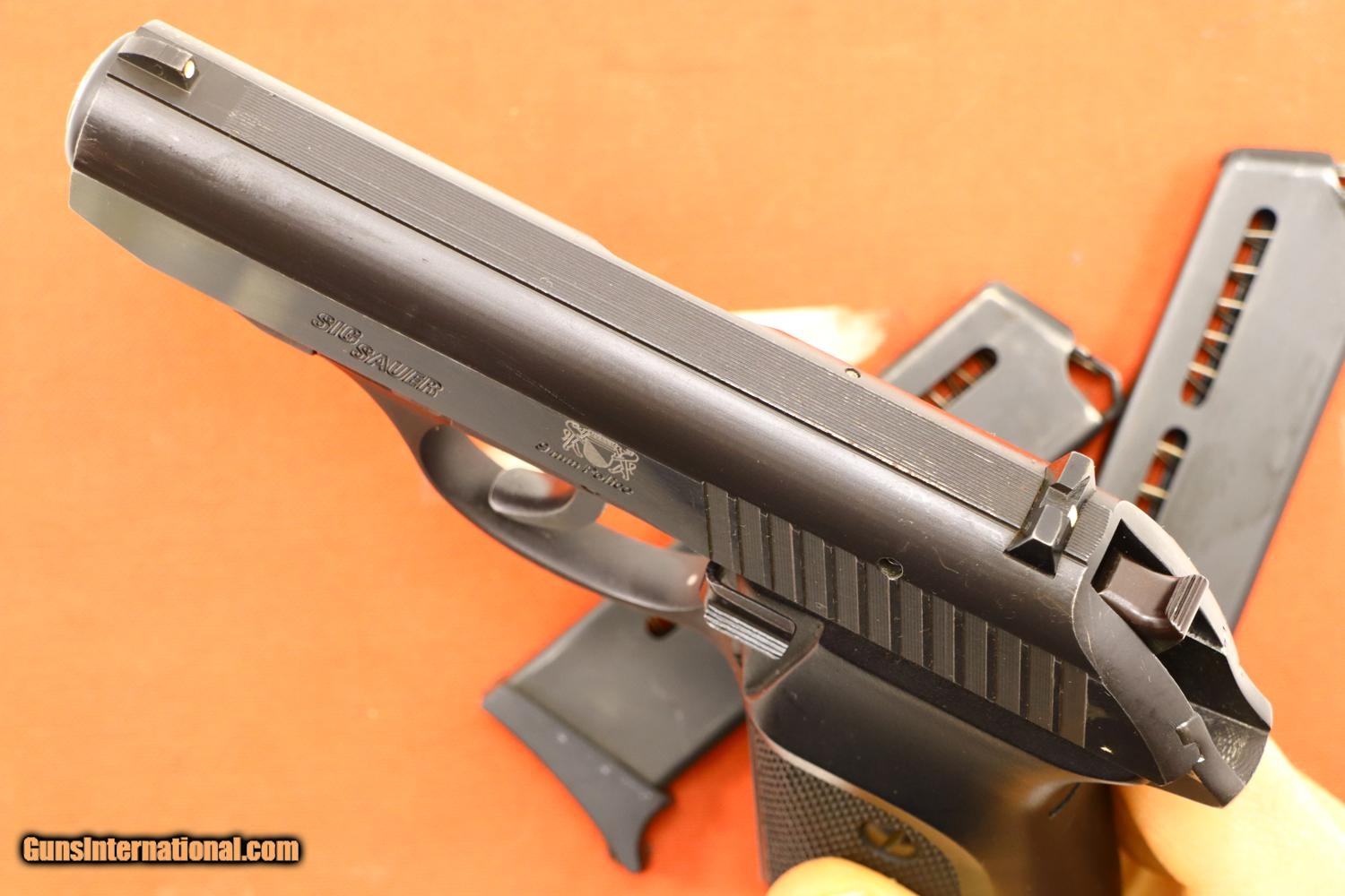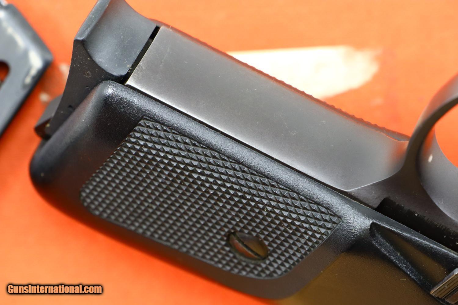 Description: Standard configuration SIG Sauer P230 with fixed front sight and drift adjustable rear sight, with usual white paint highlighting. Left side of slide marked for manufacturer and caliber 9mm Police (not interchangeable with .380 ACP). Bold Zurich Canton logo. Right side of slide marked with the model and serial number that is repeated on the inside of the frame. Black plastic grips, left panel with shallow finger rest, molded checkering around the grip screws. Unmarked finger extension magazines, each side with two vertical indicator slots. Complete with original reddish-orange box, white lettering, top of box with partially removed serial number “107770”, end label with correct serial number. Original booklet. Synopsis: SIG Sauer P230 pistol, caliber 9mm Police, this example marked for Zurich Police, boxed with booklet and spare magazine. Condition: VG+ as one might expect from a carried/holstered police pistol. Comparable condition grips. Mirror bright bore. Perfect manual mechanics. Box with scuffs, grey foam lining removed from base. VG/EXC booklet. ~~Insured shipping fee of $45; most packages shipped using FedEx 2nd Day.~~ SOLD Manufacturer: SIG Sauer Serial Number: S104106 Caliber Info: 9mm Police |