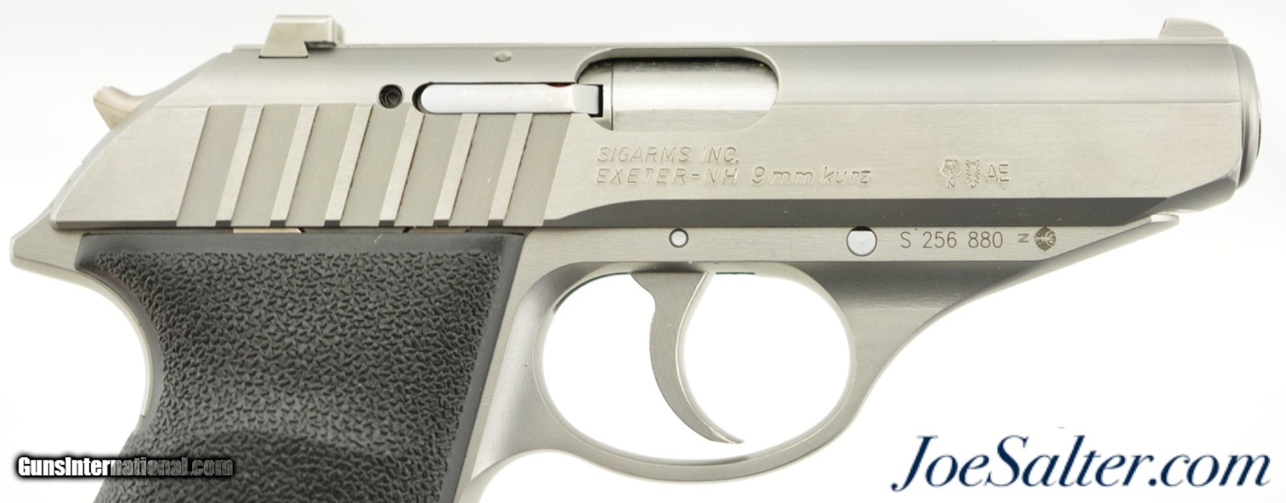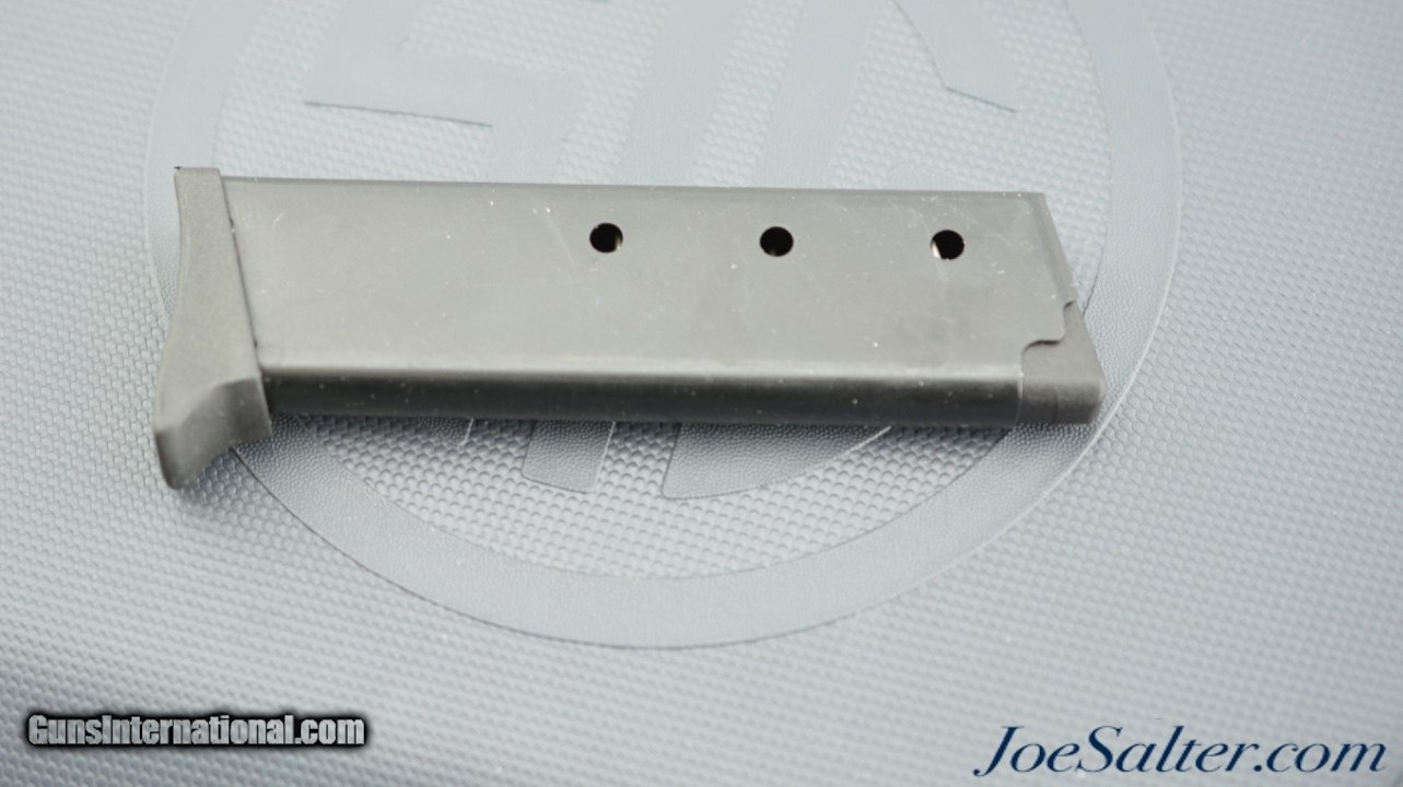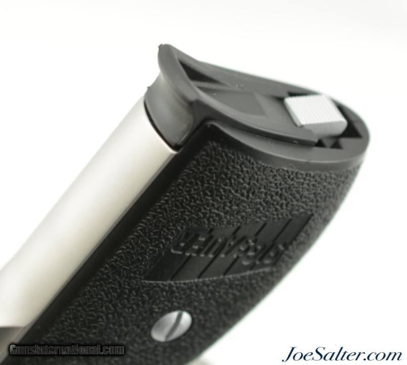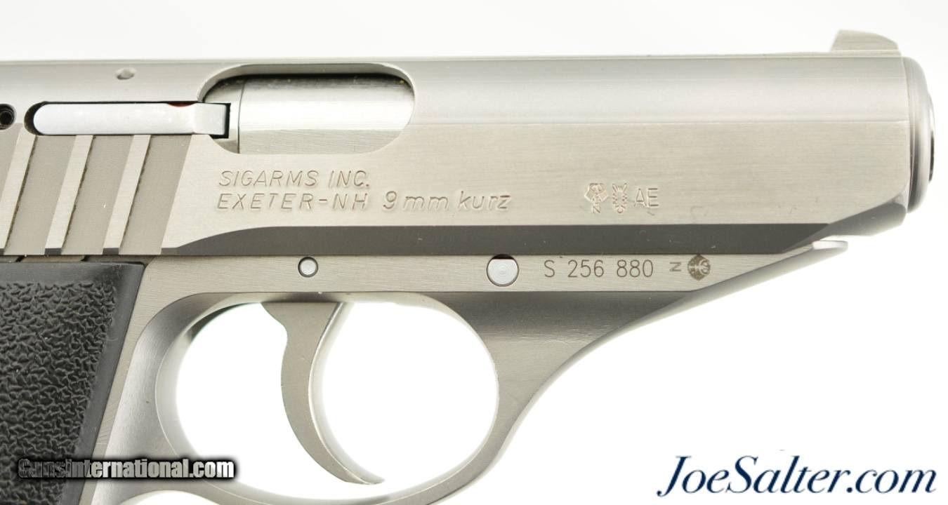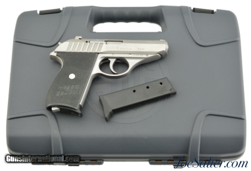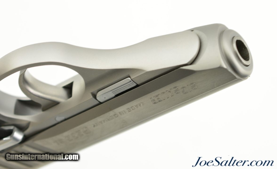 Description: Serial #S256880, .380 ACP (9mm Kurtz), 3.5 inch barrel with an excellent bore. This is the German made Sig Sauer Model P232 SL semi-automatic pistol. The stainless pistol features the European bottom magazine release and red sight inserts. In excellent condition the metal surfaces show very light use and handling marks. The synthetic black grips are likewise excellent. It comes in a gray Sig Sauer plastic case with two, 7 round magazines, one is a Sig marked (zipper back) stainless and the other is an unmarked blue steel, and lock. FFL SOLD |