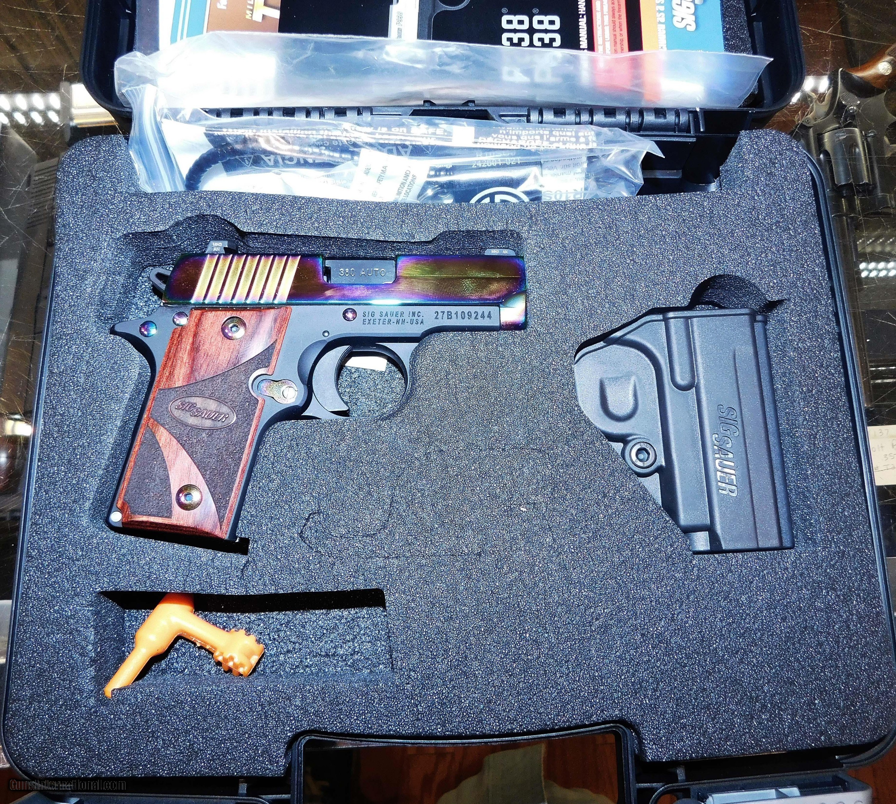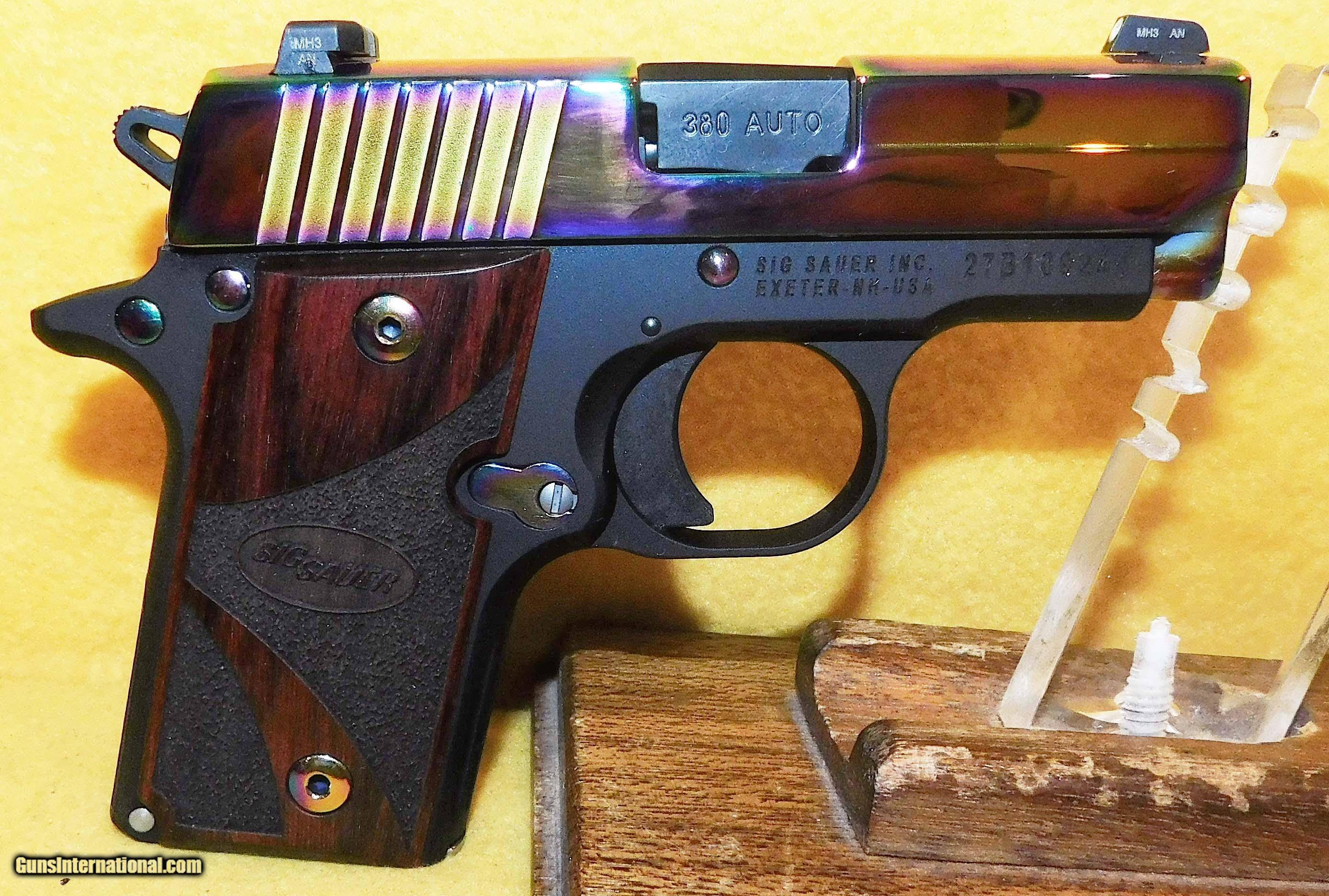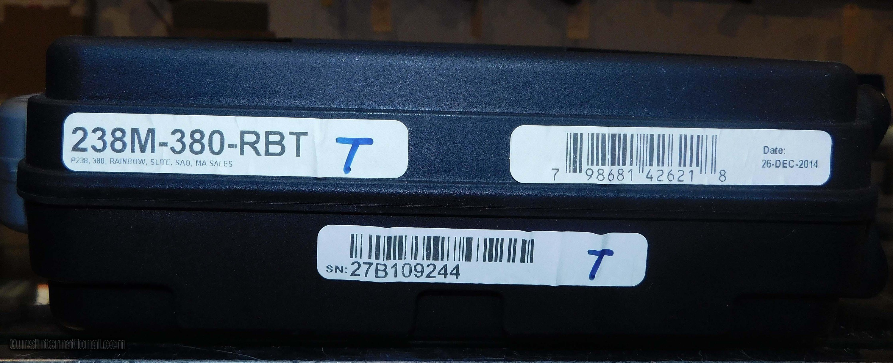 Description: SG SAUER P238 IN .380 ACP CAL., WITH BARREL. COLOR RAINBOW. CONDITION 98%+ LIKE NEW . SERIAL NUMBER 278109244. SIG SAUER MODEL P238 IN .380 ACP CALIBER, MIRROR BORE, RAINBOW FINISH, GRIPS EXCELLENT, HARD CASE WITH PAPERS, COMES WITH ONE FACTORY MAGAZINE, HOLSTER, 98%+ LIKE NEW OVERALL CONDITION, OUR STOCK # D3394 SOLD |
