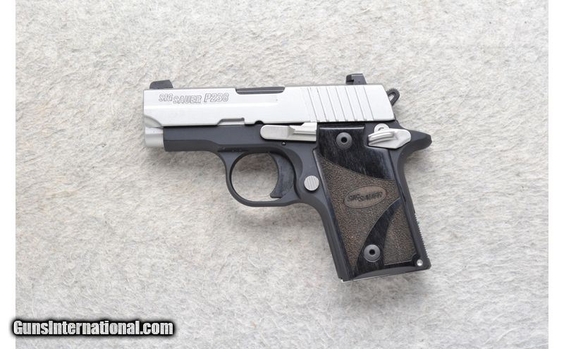 Description: This Sig Sauer Model P238 is a right hand semi-auto pistol in .380 ACP Cal. It has a 2.75 inch barrel with a rear serrated stainless steel slide. A blade front and notch rear sight with 3 white sight dots. The grip panels are a lightly textured walnut with Sig Sauer. .380 ACP SOLD Chambers: Semi-Auto 6 round magazine. Metal Condition: Excellent. Wood Condition: Excellent. Bore Condition: Excellent. Barrels: 2.75 inch barrel. Triggers: Solid. Grooved. Weight: 16 oz. Sights: Blade front. Notch rear. 3 white sight dots. Item Location: Richfield, WI |