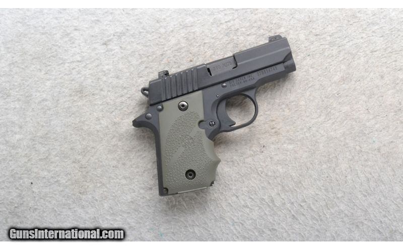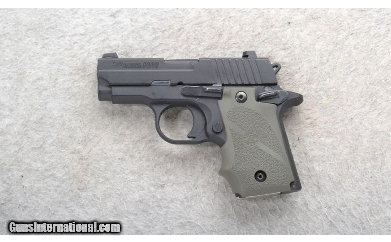 Description: This Sig Sauer Model P238 is a right hand semi-auto pistol in .380 ACP Cal. It has a 2.75 inch barrel with a rear serrated slide. A blade front sight and notch rear sight with 3 luminous sight dots. The grip is a Hogue textured green rubber with finger groove. The original checkered rosewood grip panels are included .380 ACP SOLD Chambers: 6 round magazine. Metal Condition: Excellent. Bore Condition: Excellent. Barrels: 2.75 inch barrel with a rear serrated slide. Weight: 16 oz. Sights: Blade front. Notch rear. 3 luminous sight dots. Item Location: Richfield, WI |