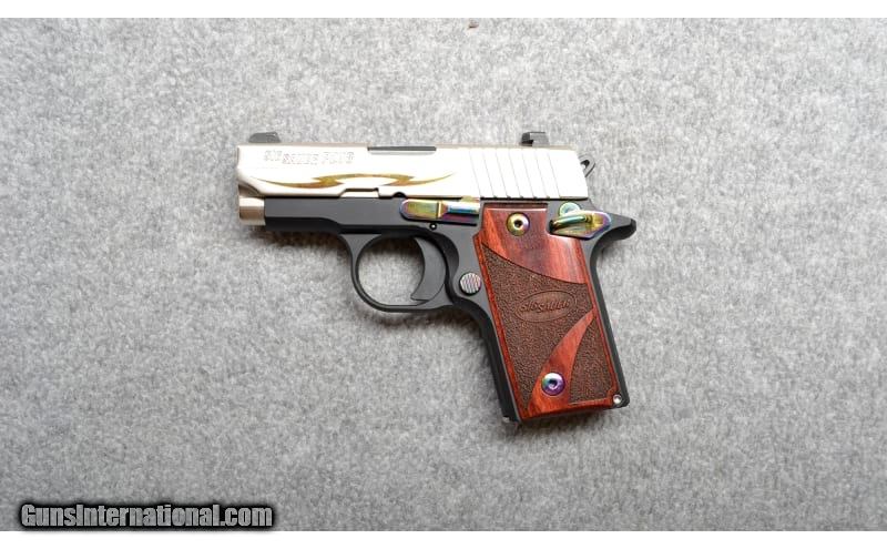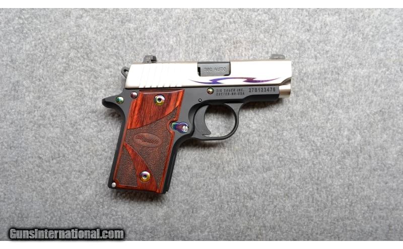 Description: Pre-owned SIG Sauer P238 chambered in .380 AUTO, 2.70" barrel, Custom Rosewood grips, Nickel Plated Stainless Slide with Rainbow Titanium Tribal Patterns. .380 ACP SOLD Metal Condition: Very good condition Bore Condition: Bright and shiny with great rifling Barrels: 2.7 inches Weight: 1 lbs Sights: Blade front sight and notch rear sight with luminous sight dots Item Location: Springfield, OR |
