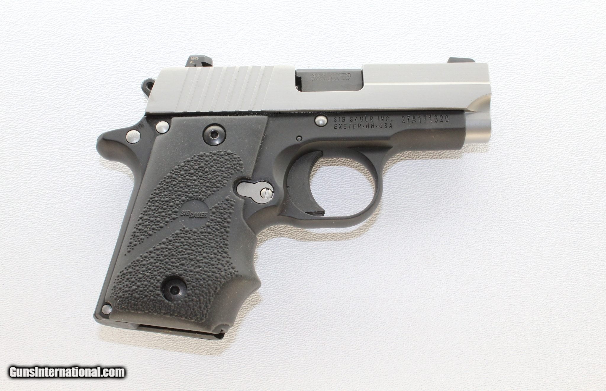 Description: Guns Listing ID: 1104524 SER #27A171320, 380 ACP, 2 3/4” barrel with a bright excellent bore. The stainless steel slide and controls rate excellent while the remaining metal surfaces retain about 96% original black Nitron finish with a few handling marks by the slide stop and some light operational silvering on the barrel. The Hogue style black grips with Sig Sauer logos rate good. The tritium SigLite night sights still glow faintly, two factory magazines is included and the action appears to function well mechanically. Included is the original factory hardcase, and laser sight, paperwork. SOLD Manufacturer: SIG SAUER Model: P238 Caliber Info: .380 ACP Condition: Used - Non-Certified Barrels: 2.75 BARREL Finish: TWO TONE BLACK AND STAINLESS |