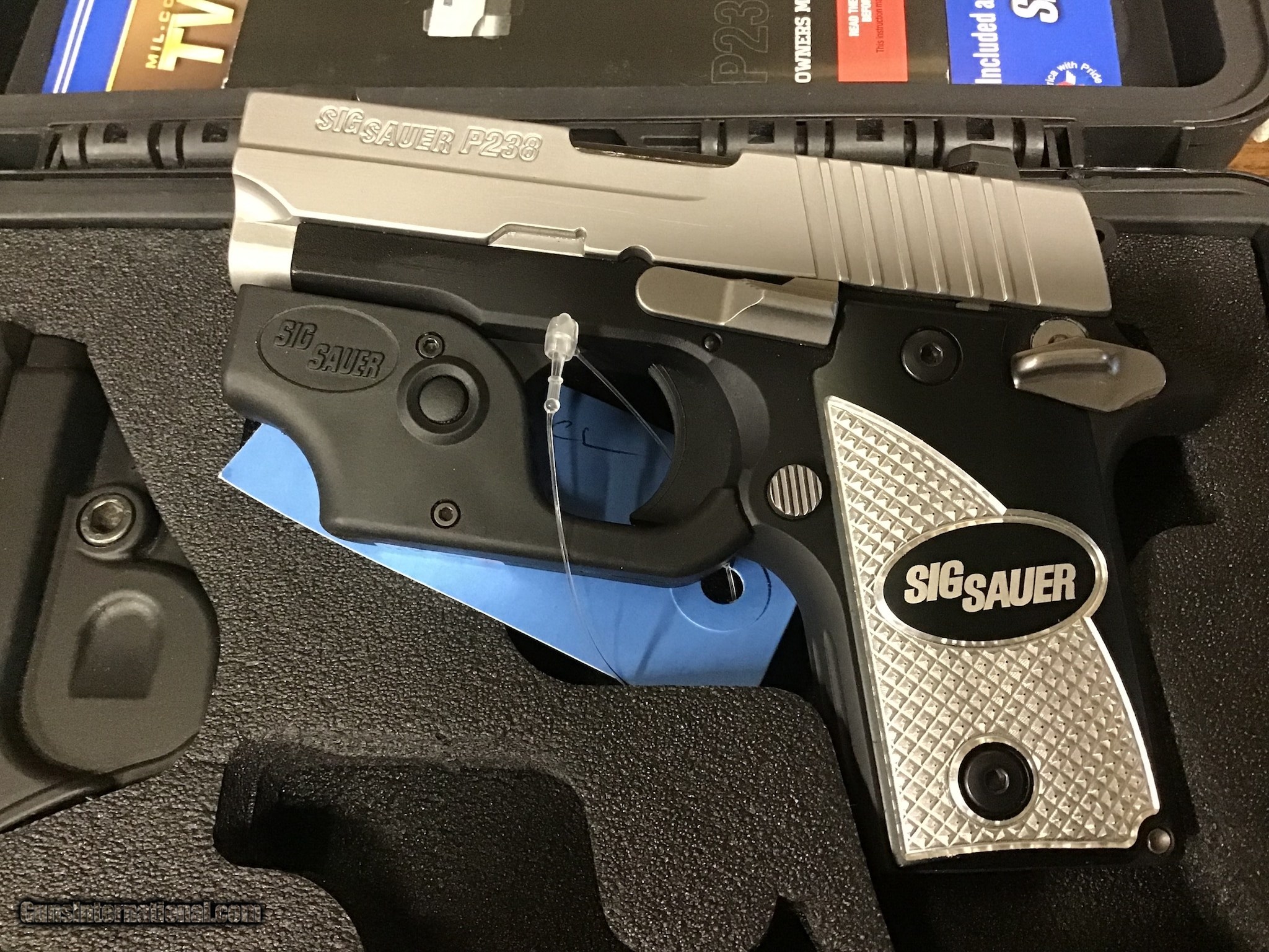 Description: Guns Listing ID: 1113204 SIG SAUER P238, 1MAG, SIG LAZER, ORIG CASE SOLD Manufacturer: SIG SAUER Model: P238 Caliber Info: .380 ACP Condition: Used - Non-Certified Barrels: 2.75 BARREL Finish: TWO TONE. BLACK/SILVER |
