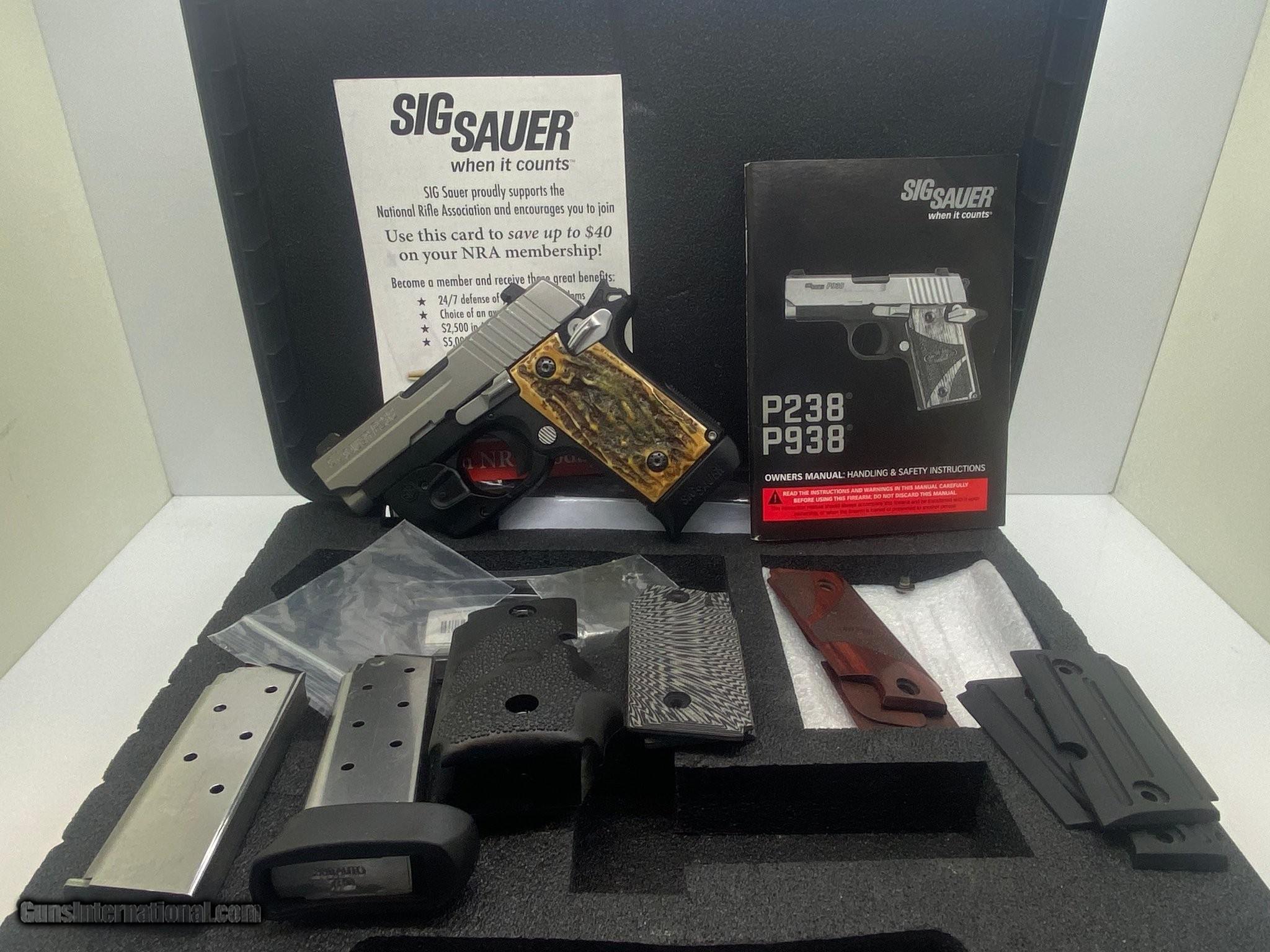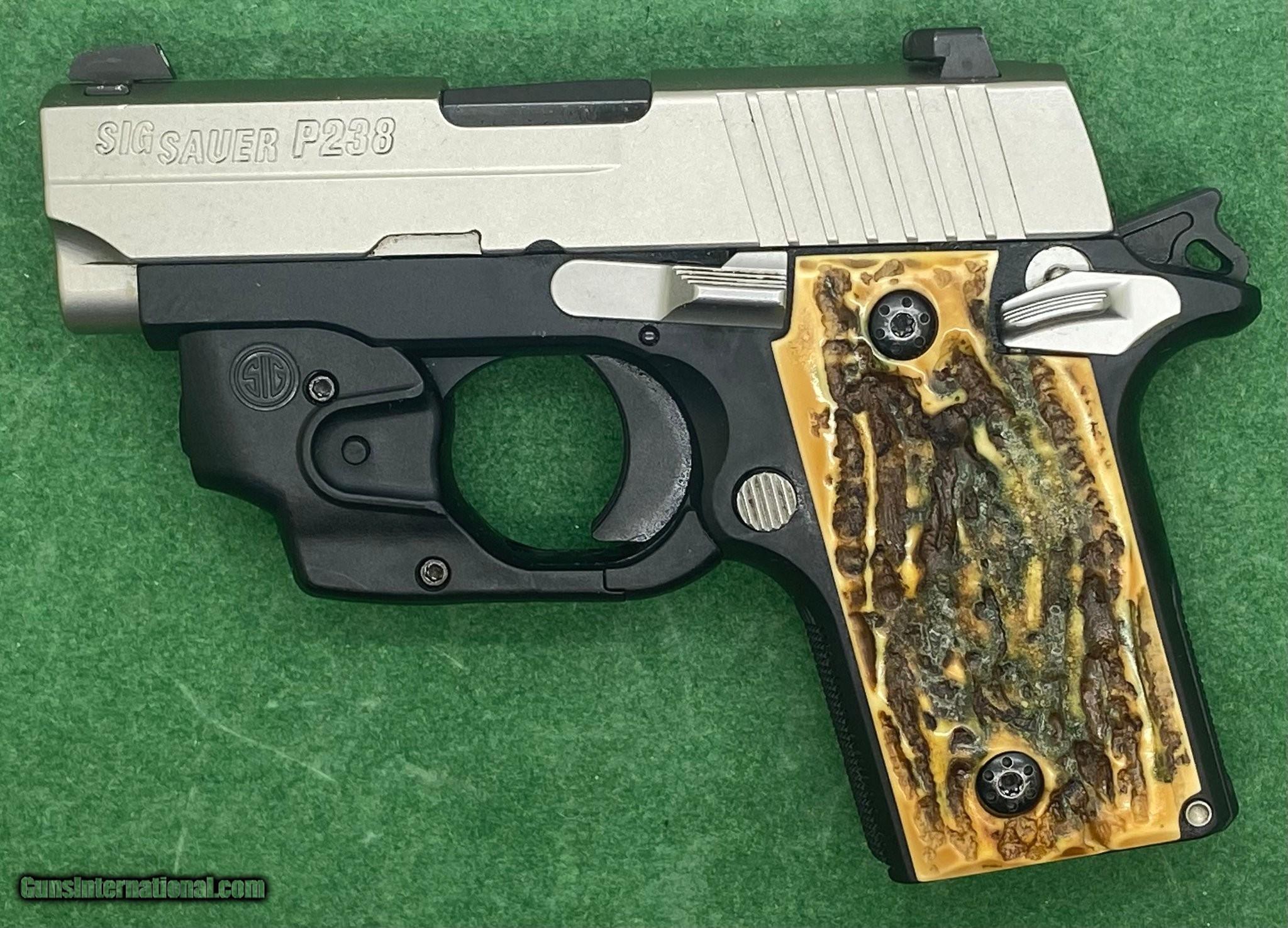 Description: Guns Listing ID: 560344 SIG SAUER Model P238 .380 ACP, Pistol 2.7\" Barrel, G10 Composite Grip, Stainless Finish, Night Sights, 6 Round The P238 is built on an anodized alloy beavertail style frame with fluted aluminum grips for comfort and a secure hold during rapid fire usage. The stainless steel slide features the popular Sig Sauer slide serrations and improves overall performance and accuracy. The sear and trigger return spring are redesigned to prevent spring over ride of the ejector during assembly. Seller Description: The Sig Sauer P238 is a compact, semi-automatic pistol chambered in .380 ACP. It‚s known for its reliability, high-quality construction, and 1911-style design in a very small, easily concealable package. Key Features: * **Caliber:** .380 ACP * **Action:** Single-action only * **Capacity:** Typically 6+1 or 7+1 with extended magazines * **Frame Material:** Aluminum alloy * **Slide Material:** Stainless steel * **Barrel Length:** 2.7 inches (approx.) * **Overall Length:** 5.5 inches * **Weight (unloaded):** \~15.2 oz * **Sights:** SIGLITE night sights (on many models) * **Safety:** Manual thumb safety (1911-style) Pros: * Excellent **build quality** * **Night sights** standard on most models * **Smooth trigger** (single-action) * **Accurate** for its size * Great for **concealed carry** * Wide variety of **finishes and custom grips** ### Variants: Sig has released many P238 variants with different finishes (like **Rainbow Titanium**, **Legion**, **Nitron**, **Scorpion**, etc.), grips (wood, G10, rubber), and slide serrations. (5) GRIPS INCLUDE LEGION GRIP,NITRON,SCORPION,RED WOOD,SILICON GRIP,ALL BLACK GRIPS (2) 6 +1 ROUNDS (1) 7+1 ROUNDS RED DOT LASER ORIGINAL BOX AND PAPERS INCLUDED SOLD Manufacturer: SIG SAUER Model: P238 Caliber Info: .380 ACP Condition: Used - Non-Certified Barrels: 2.7" BARREL Action: SEMI AUTOMATIC Finish: black & stainless |