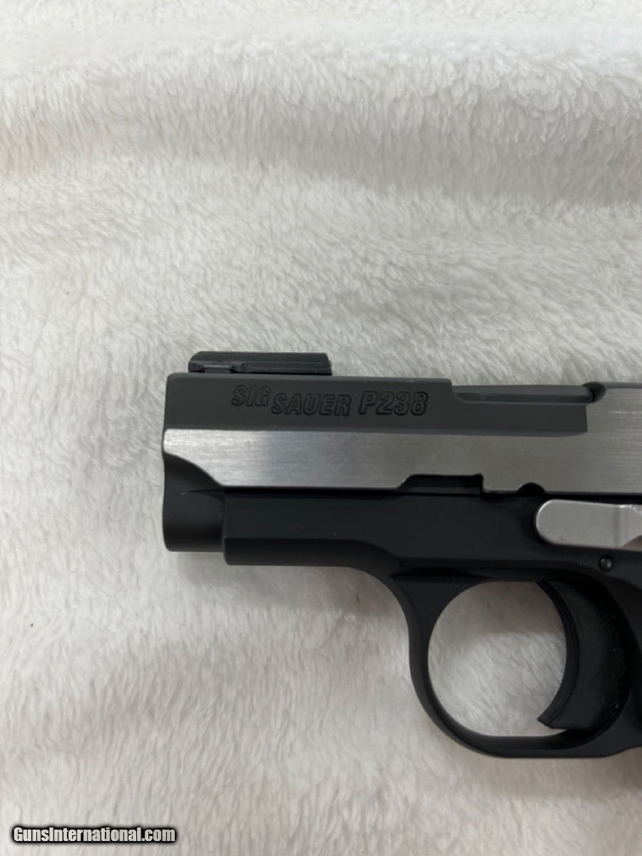 Description: Guns Listing ID: 1078059 Inventory Number: FCN015327 Description: PISTOL: SIG SAUER MODEL P238 EQUINOX, BLUE, YES - INCLUDES ORIGINAL BOX AND PAPERS, 2.5, 380 ACP, SEMI - AUTOMATIC Specific Details: NRA Modern Gun Condition Rating Standards: EXCELLENT: New condition, used but little, no noticeable marring of wood or metal, bluing perfect, (except at muzzle or sharp edges). Finish / Color: Blue Case & Box: Yes - Includes original box and papers Caliber: 380 ACP Action: Semi - Automatic Magazine: Yes - Includes Original Magazine (s) Holster: No - Not Included SOLD Manufacturer: SIG SAUER Model: P238 EQUINOX Caliber Info: .380 ACP Condition: Used - Non-Certified Barrels: 2.75 BARREL Finish: TWO-TONE |