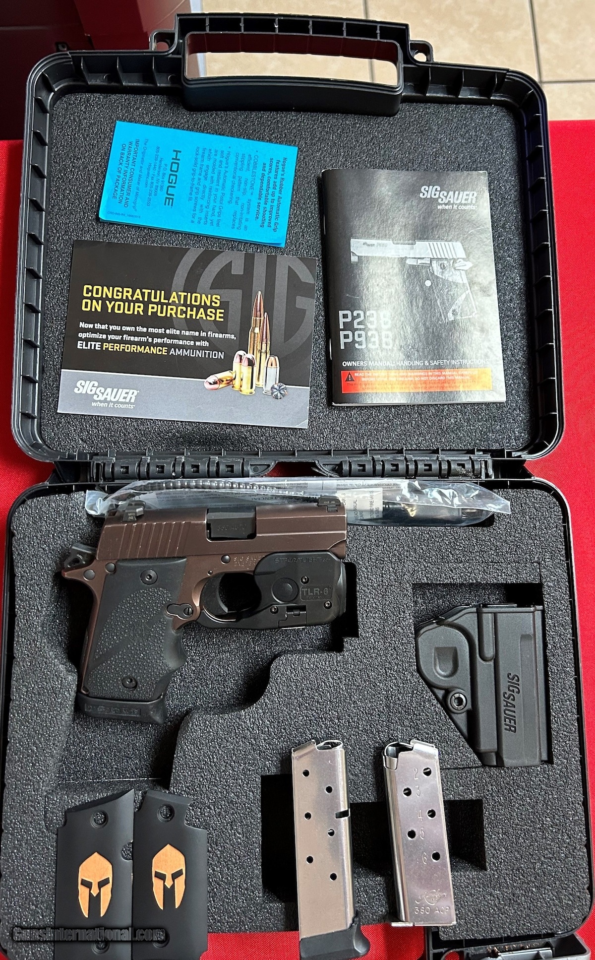 Description: Guns Listing ID: 773937 SIG SAUER P238 SPARTAN Comes with factory box and paperwork Factory holster Houge grips and original grips 3 Magazines TLR-6 Light and laser combo SOLD Manufacturer: SIG SAUER Model: P238 SPARTAN Caliber Info: .380 ACP Condition: Used - Non-Certified Barrels: 2.7 BARREL |