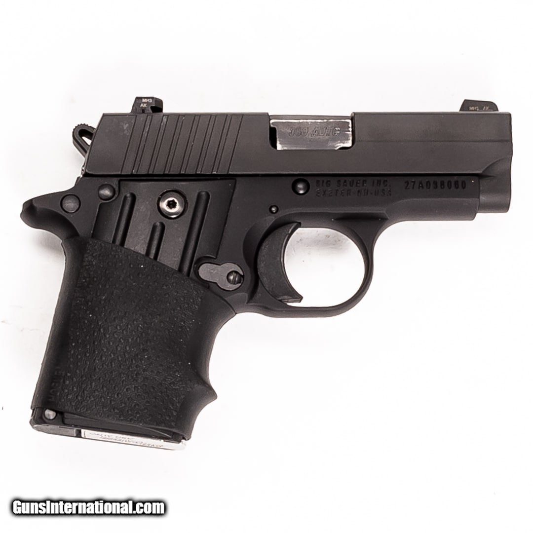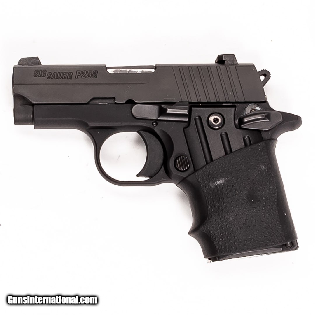 Description: Guns Listing ID: 328689 The Sig Sauer P238 is a 380 ACP semi-automatic handgun patterned off the 1911. 3-8 round magazines, 3-6 round magazines and the original box are included. This model features night sights. SOLD Manufacturer: SIG SAUER Model: P238 Caliber Info: .380 ACP Condition: Used - Certified Barrels: 2.7 BARREL Finish: BLACK |