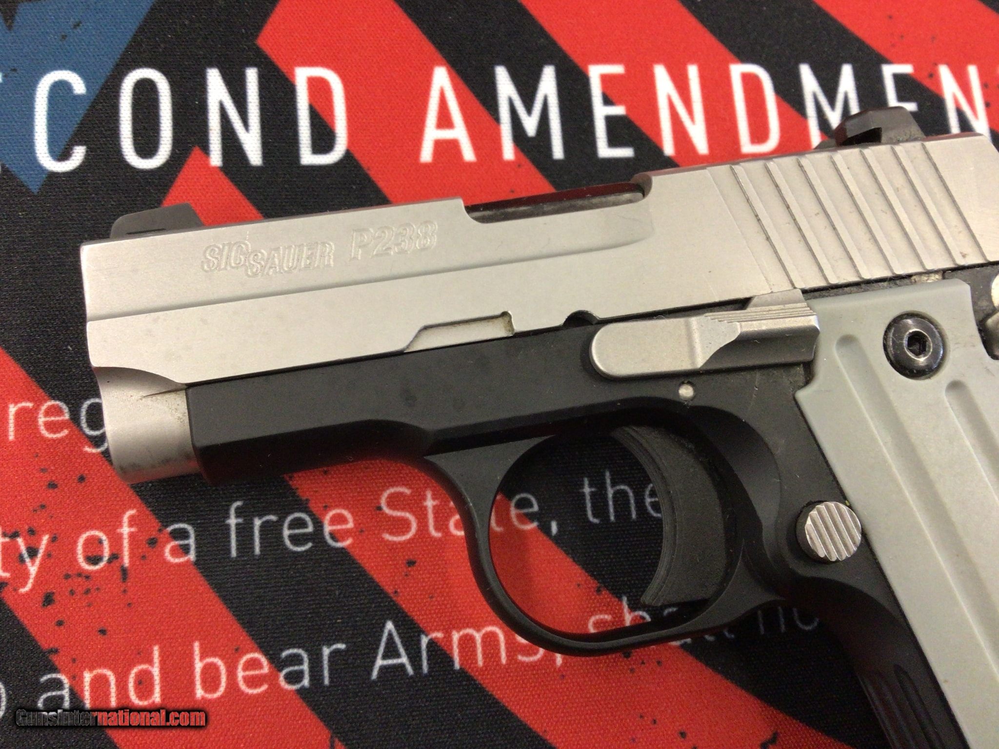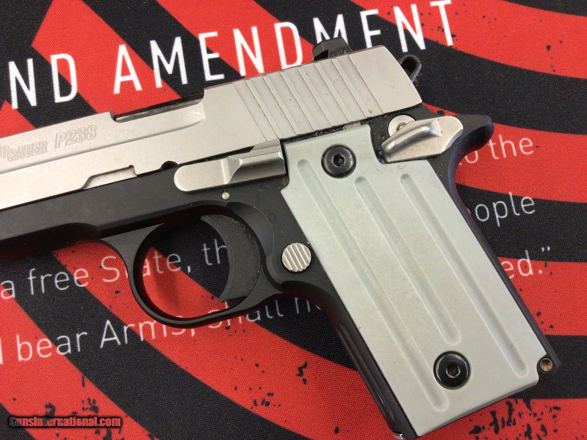 Description: Guns Listing ID: 501844 Used Sig Sauer P238 in 380 acp. Stainless slide, black frame with grey grips. Comes in original box with manual. 1 magazine. SOLD Manufacturer: SIG SAUER Model: P238 Caliber Info: 380 ACP Condition: Used - Non-Certified Barrels: 2.75 BARREL Finish: STAINLESS AND BLACK |
