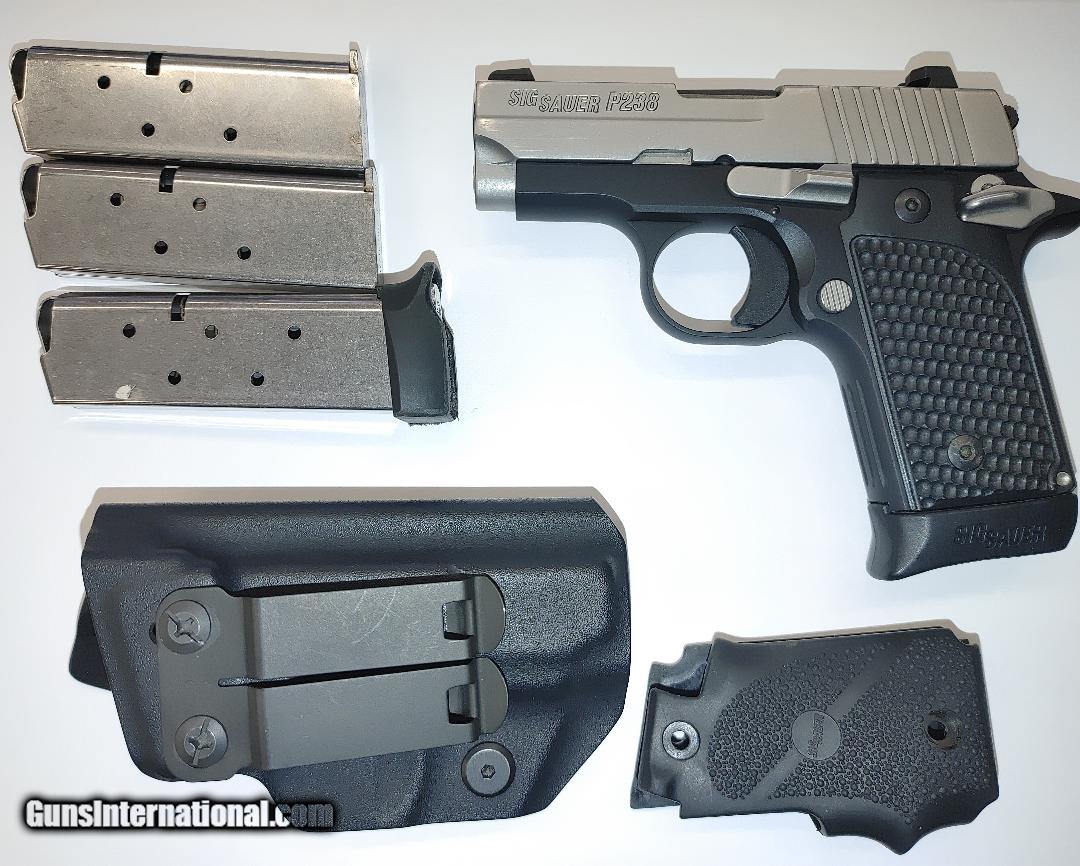 Description: Guns Listing ID: 645189 Sig Sauer P238, 380 acp with G10 Grips, Rubber Grips, 2-7rd mags, 2-6rd mags, zippered case, RH IWB Holster. SOLD Manufacturer: SIG SAUER Model: P238 Caliber Info: 380 ACP Condition: Used - Non-Certified Barrels: 2.5 BARREL Finish: STAINLESS AND BLACK |