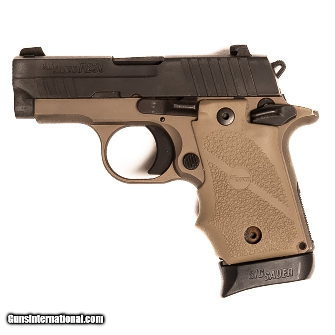 Description: Guns Listing ID: 835829 The Sig Sauer P238 is a sub-compact handgun designed for concealed carry. It has an all-metal design, excellent ergonomics, and is surprisingly accurate for having such a short barrel. This P238 features a laser and includes the original case, manual, and six 7-round magazines. Get the best bang for your buck when you get a Certified Used Firearm . When you see the Certified Used stamp on any of our firearms, you can be confident that you’re getting exactly what you want – a gun only in very good to excellent condition and held to the highest quality standard. All Certified Used Guns come with a ‘no questions asked’ return policy . PLUS, ALL CERTIFIED USED GUNS SHIP FREE! SOLD Manufacturer: SIG SAUER Model: P238 Caliber Info: .380 ACP Condition: Used - Certified Barrels: 2.7 BARREL Finish: FDE |