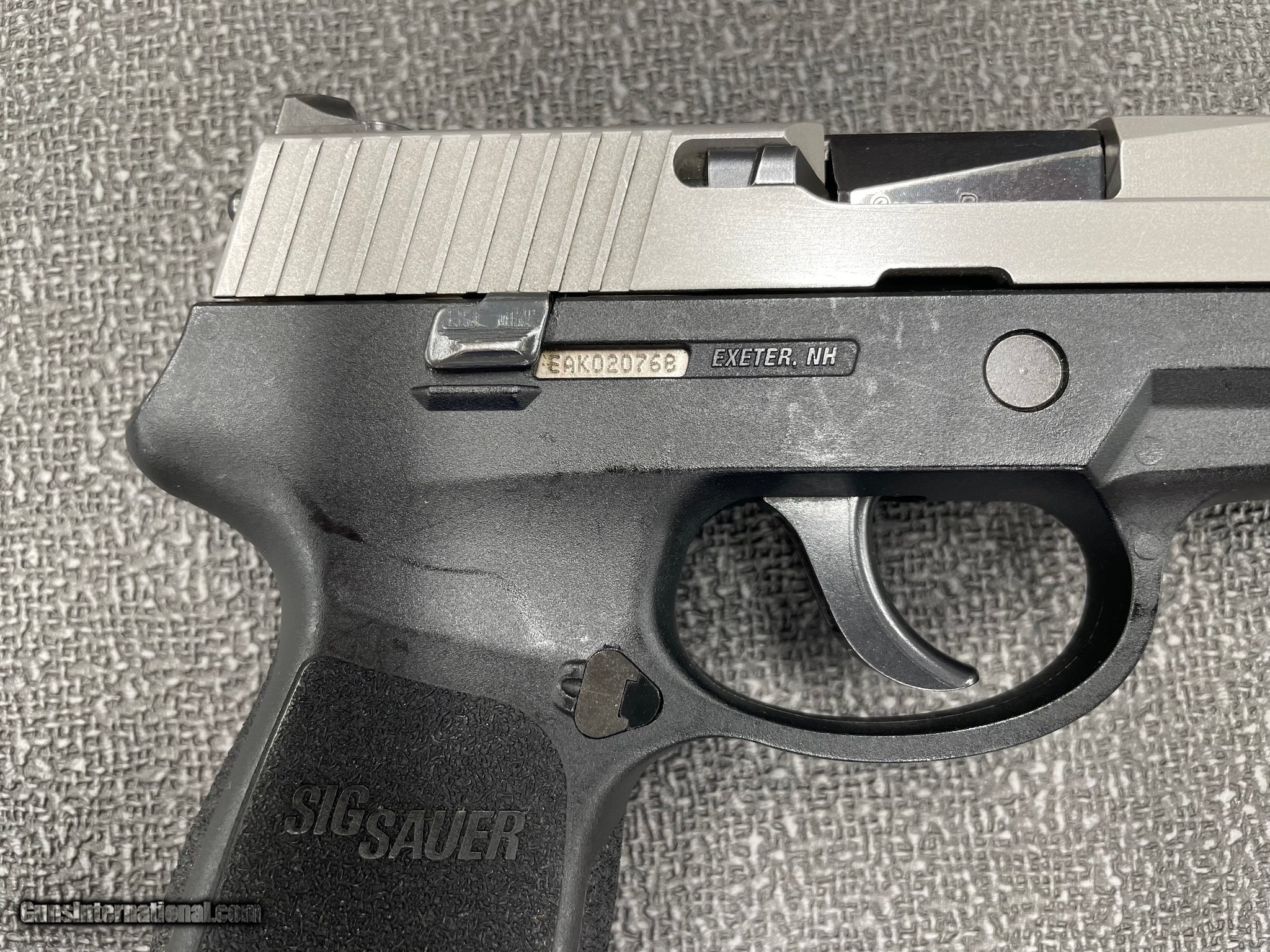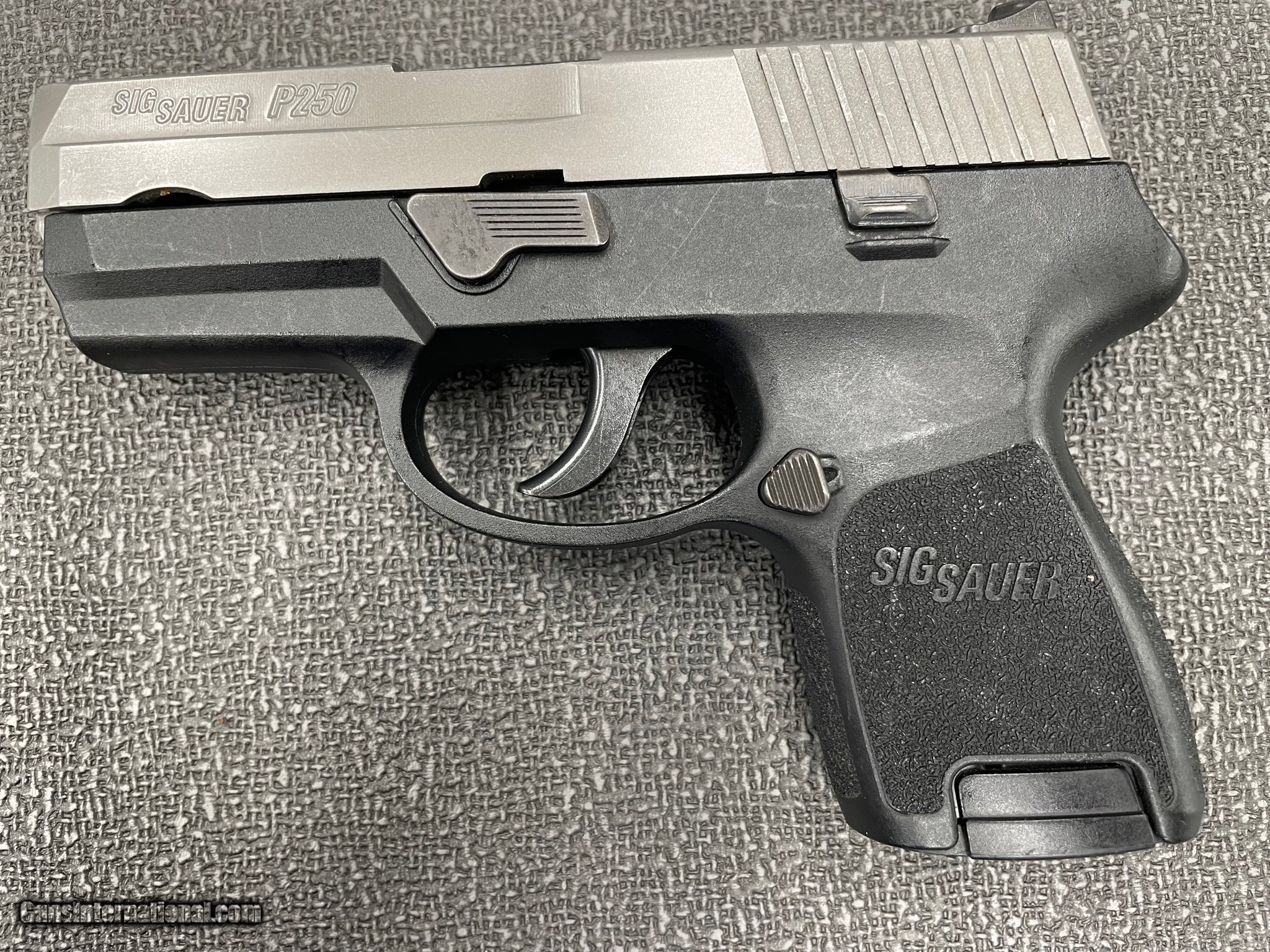 Description: Guns Listing ID: 1275893 Used Sig Sauer P250 9MM. Has several scuffs and scratches. SOLD Manufacturer: SIG SAUER Model: P250 Caliber Info: 9MM LUGER (9X19 PARA) Condition: Used - Non-Certified Barrels: 3.6 BARREL Finish: TWO TONE BLACK AND STAINLESS |