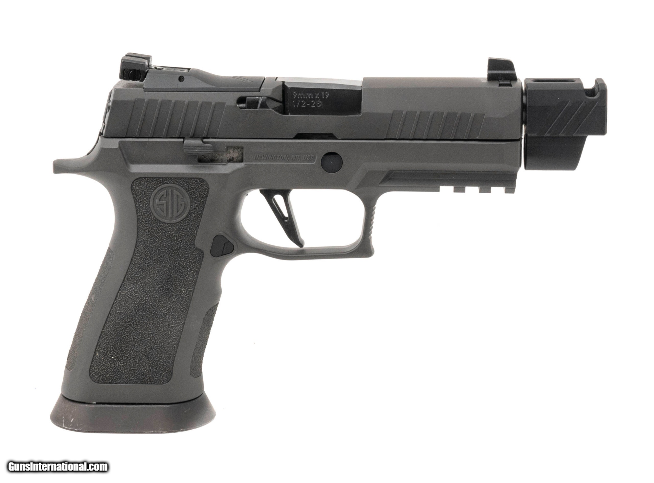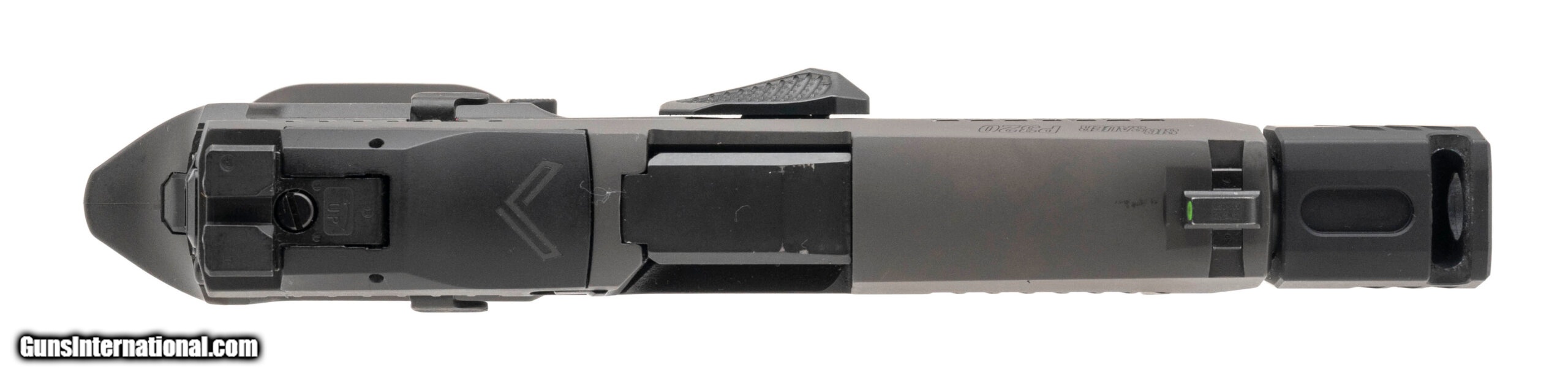 Description: "SN: 58J514618. Modern production. Full-size striker fired handgun made by Sig. 4"" threaded barrel chambered for 9x19mm, fitted with Parker Mountain Machine Duty compensator. Near excellent condition with small handling marks on the nitron slide finish and flared magwell. Optics-ready Legion model with suppressor-height tritium night sights and improved trigger. Comes with box and spare magazine. Austin location. SOLD |
