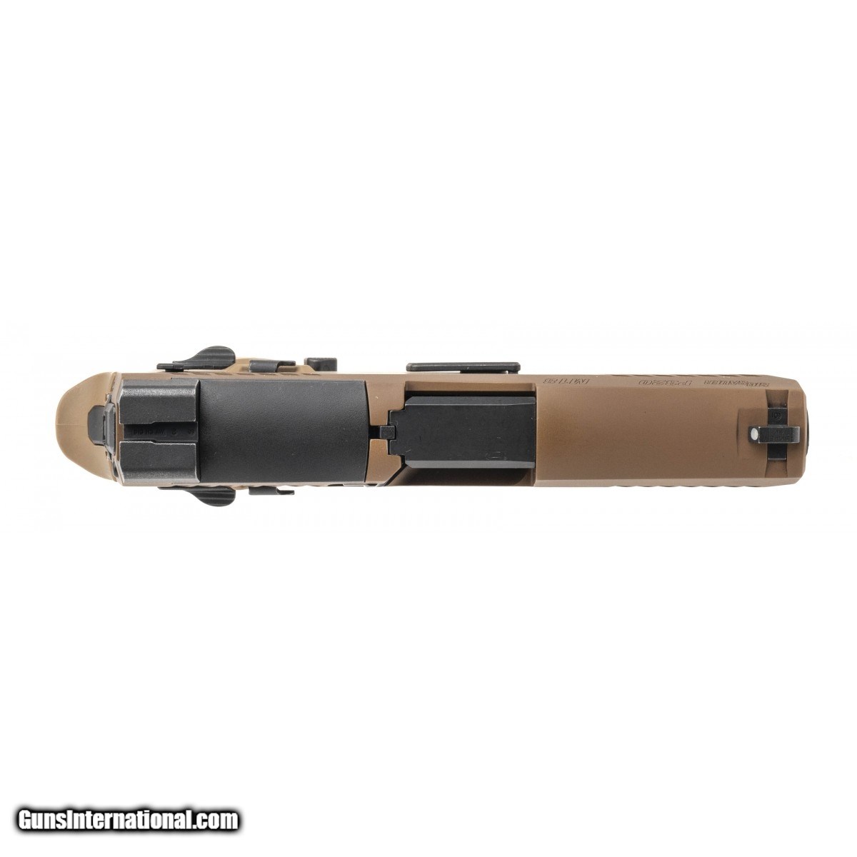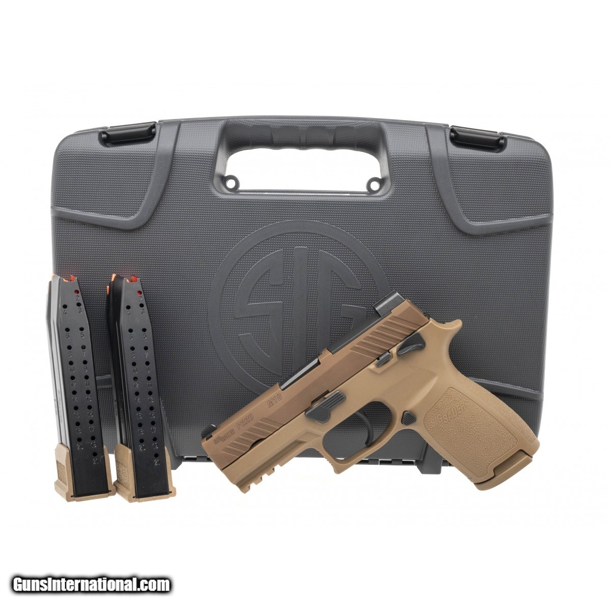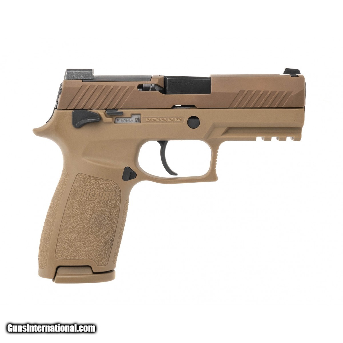 Description: "SN: M18A167036. Modern production. Semi-automatic polymer frame pistol made by Sig. 3.75"" barrel chambered for 9x19mm. Great condition with light holster wear in the tan cerakote slide and polymer frame. Features optics ready slide, three-slot underbarrel accessory rail, tritium night sights and ambidextrous controls. Comes with box and two extra magazines. Austin location. SOLD |