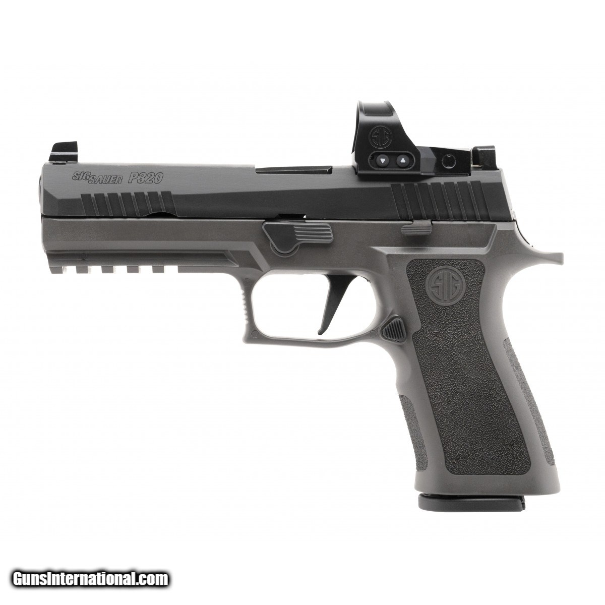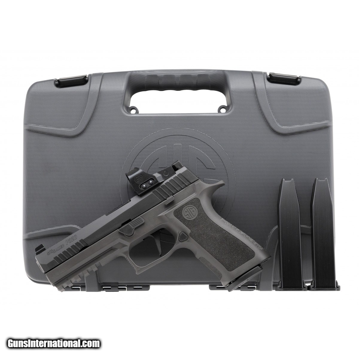 Sig 320 with the TXG grip module, suppressor height night sights, a Romeo 1 PRO mounted, flat faced trigger and, three magazines. NEW. UPC:798681628902.