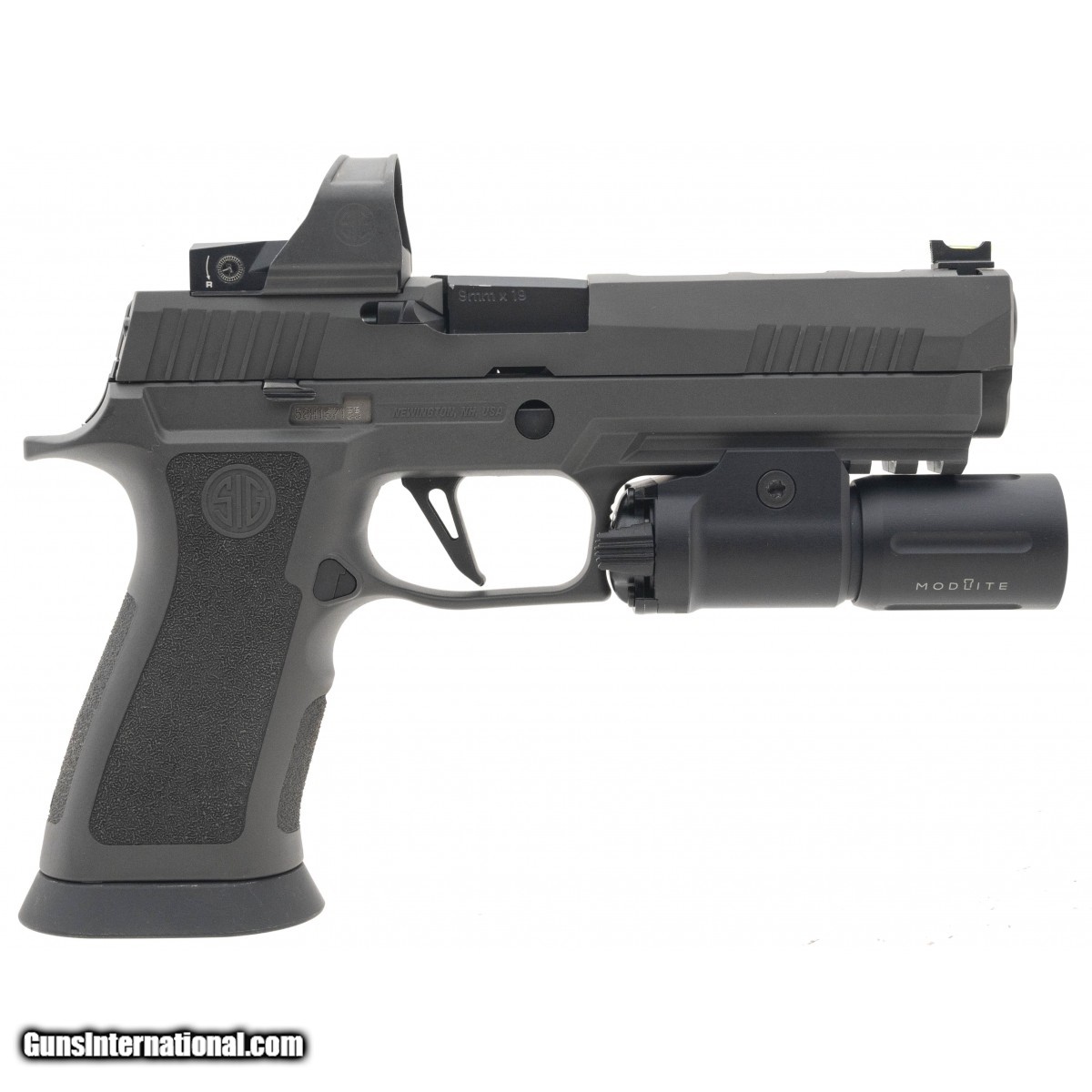 SN:58H167155. Full size pistol with a 5"" barrel, an optics ready slide and a fiber optic front sight. Overall in excellent condition, with box, 2 extra magazines, a Modlite, a PHLSTER holster and a Sig Romeo One PRO.