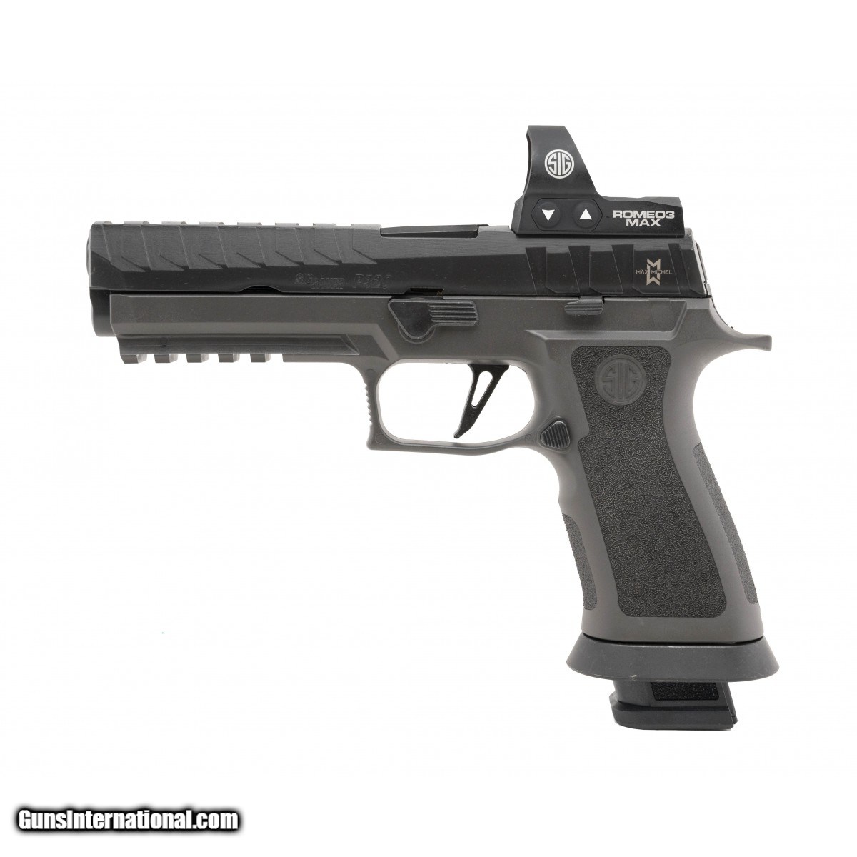 Carry-optic pistol with Sig Romeo 3 Max red dot, tungsten infused polymer frame, grey cerakote. Comes with three spare 21-round magazines. New. UPC:798681641925