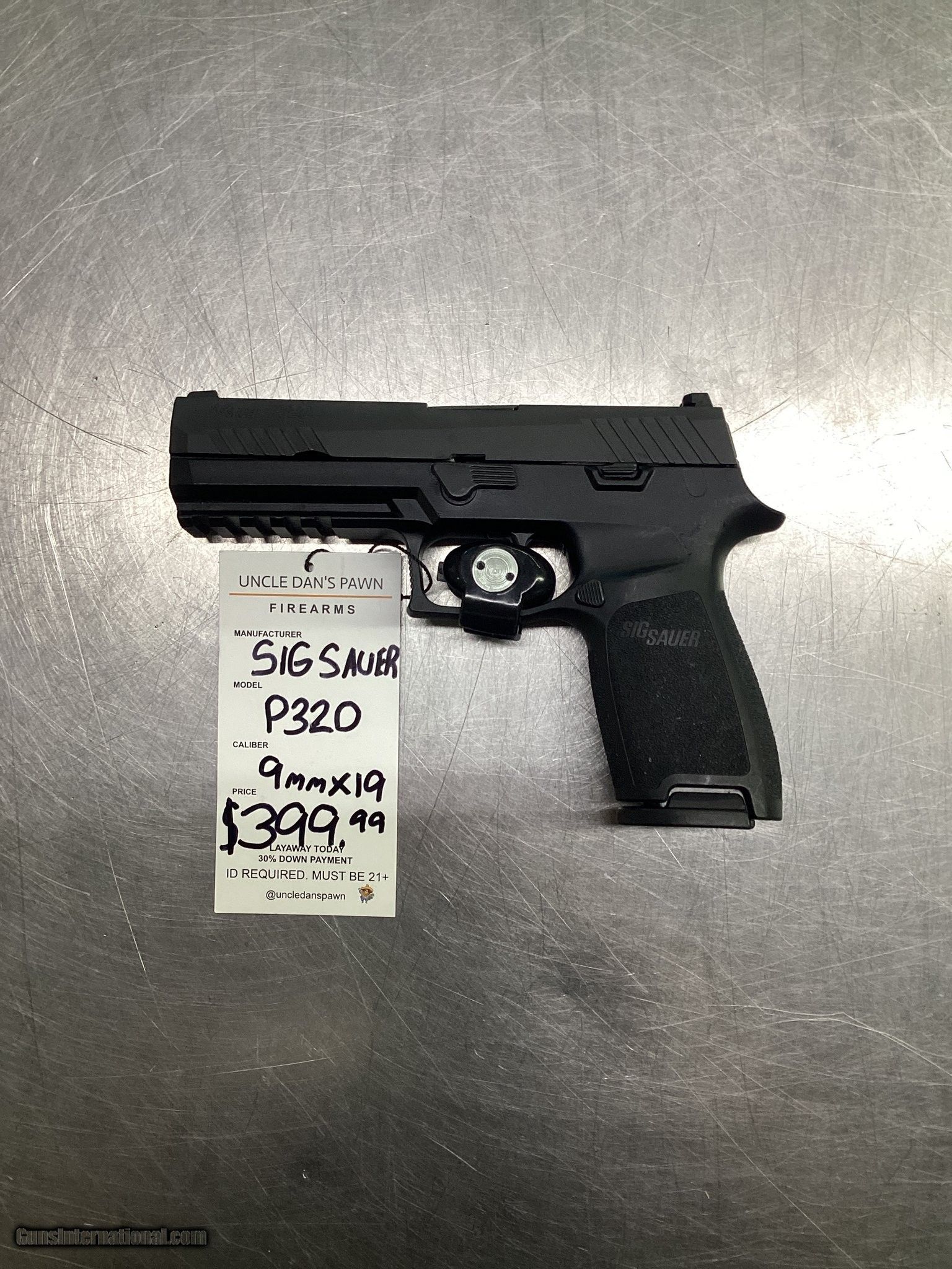 Description: Guns Listing ID: 594904 SIG SAUER P320 9mmx19 Manufacturer: SIG SAUER Model: P320 Caliber Info: 9MM LUGER (9x19 PARA) Condition: Used - Non-Certified Barrels: 4.5" BARREL Action: SEMI AUTOMATIC Finish: black matte Price: $399.99 Contact Seller |