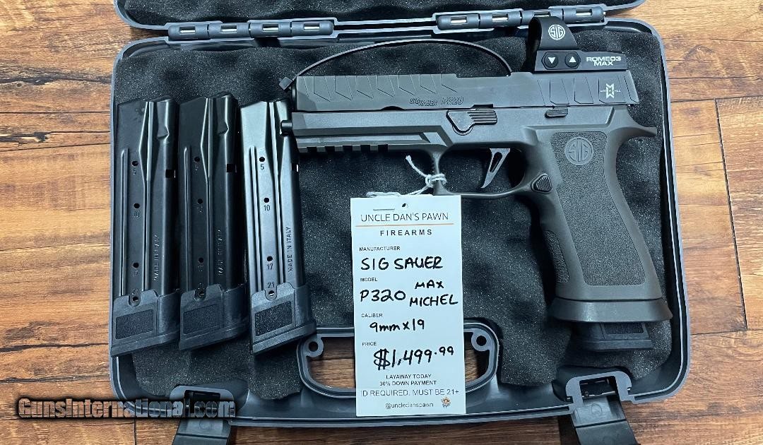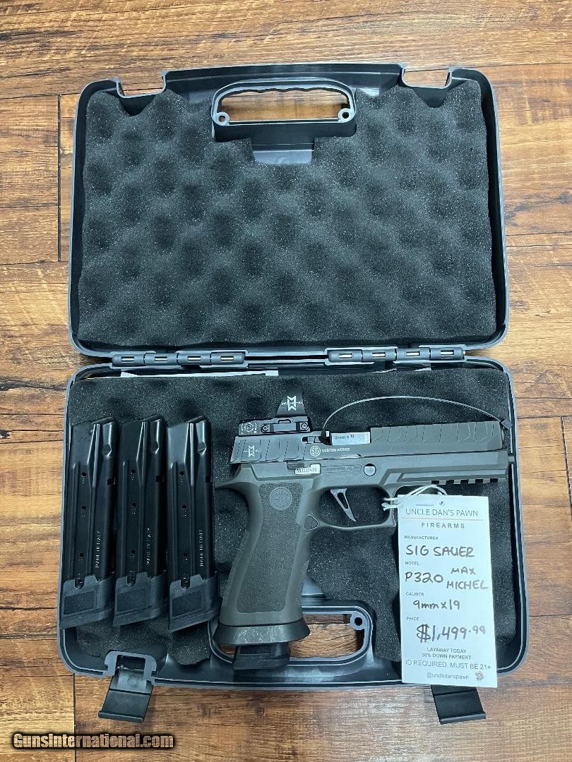 Description: Guns Listing ID: 606238 SIG SAUER P320 MAX MICHEL 9MM.ORIGINAL CASE WITH 3 EXTRA MAGAZINES AND ROMEO 3 MAX RED DOT Manufacturer: SIG SAUER Model: P320 Caliber Info: 9MM LUGER (9x19 PARA) Condition: Used - Non-Certified Barrels: 5" BARREL Action: SEMI AUTOMATIC Finish: dark grey Price: $1,499.99 Contact Seller |