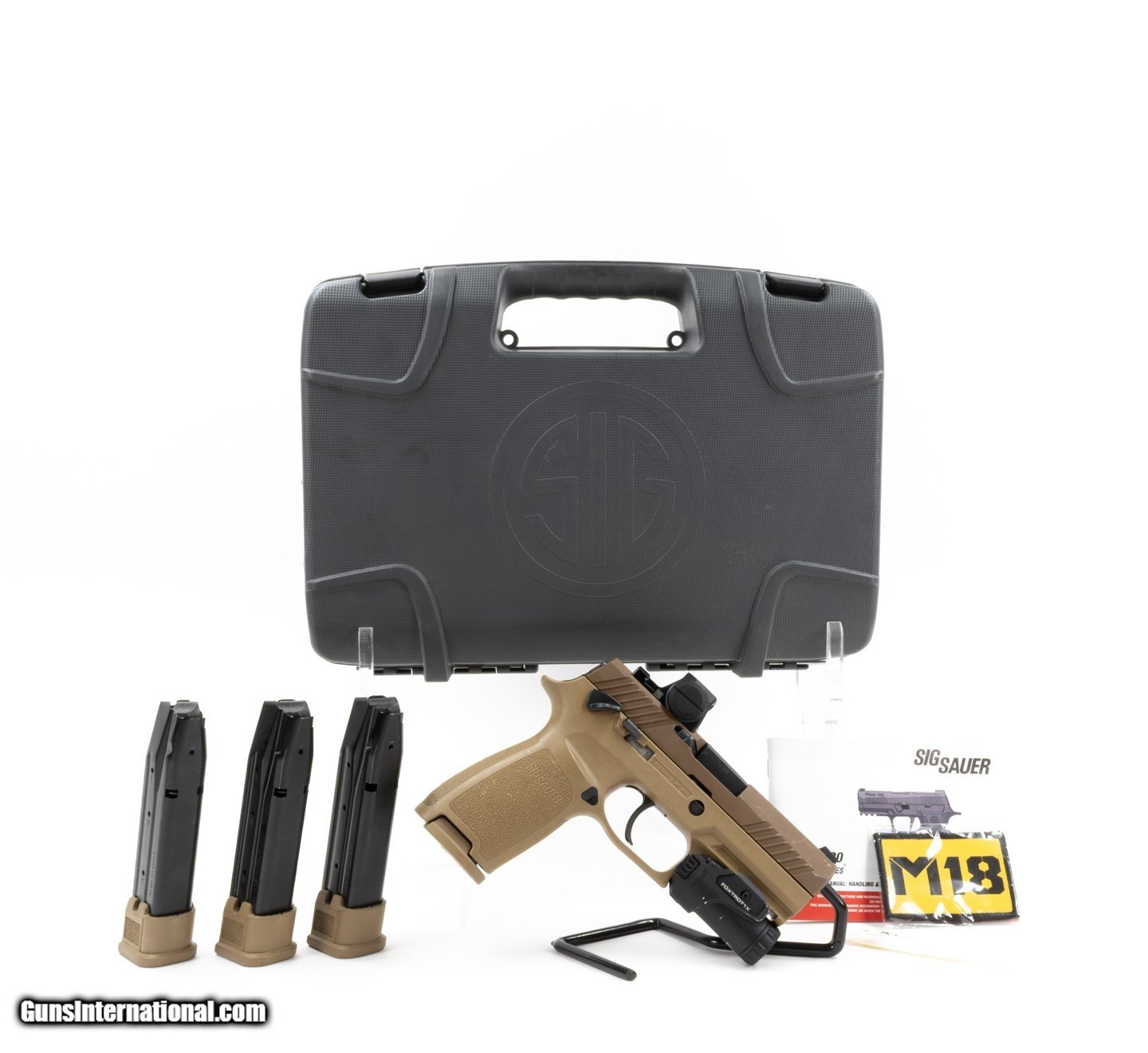 Description: Guns Listing ID: 543062 Sig Sauer P320 M18 9mm 17/21+1 w/ Romeo X, Foxtrot1X, 4 Mags & Box Manufacturer: SIG Sauer Model: P320 M18 Condition: Very Good Caliber: 9x19mm Action: Semi-Auto / Striker Fired Barrel Length: 3.75\" Capacity: 21 or 17 Sights: Front white dot and plain rear iron sights Optic: SIG ROMEO X, red dot, adjustable brighness, battery included. Co-Witness: Yes Light: SIG FOXTROT1X, ambi controls, battery not included. Size: Compact Finish: Coyote / FDE Other Features: Ambi safety. Origin: USA Inventory: Firearm, (3) 21-rd & (1) 17-rd magazines, SIG branded hard case, manual & woven patch. • Please be aware that we have not test fired this gun. Unless otherwise stated, expect this firearm to fire and function safely. SOLD Manufacturer: SIG SAUER Model: P320-m18 Caliber Info: 9MM LUGER (9x19 PARA) Condition: Used - Non-Certified Barrels: 3.75 BARREL Action: SEMI AUTOMATIC Finish: fde |