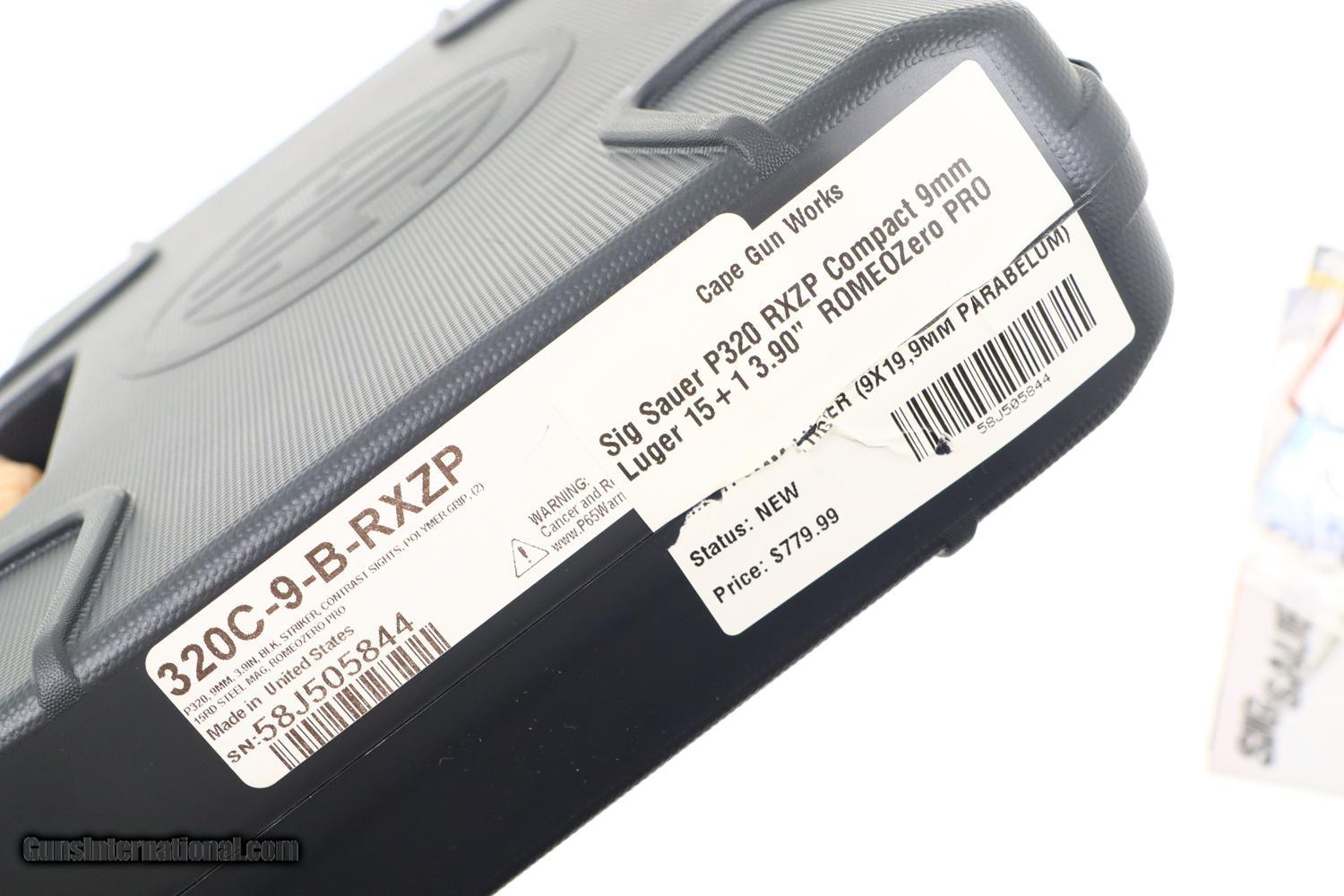 Description: Synopsis: Sig Sauer, P320, RXZP Compact, 58J505844, A-1908 Description: Desirable, as new in the box, SIG SAUER P320 RXZP compact with ROMEOZero-Pro 3 MOA reflex optic, white three-dot sights, textured polymer grip frame, ambidextrous slide stop/release, with two factory 15-round magazines. Also included is the factory-matching plastic hard case, manual, paperwork, battery for the reflex sight, cable lock with keys. Condition: Near new in factory matching box with all accessories including hang tag. Mirror bore. Perfect Manual Mechanics. ~~Insured shipping fee of $45; most packages shipped using FedEx 2nd Day.~~ SOLD Manufacturer: SIG Sauer Serial Number: 58J505844 Caliber Info: 9mm |