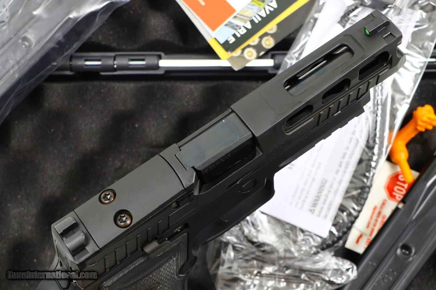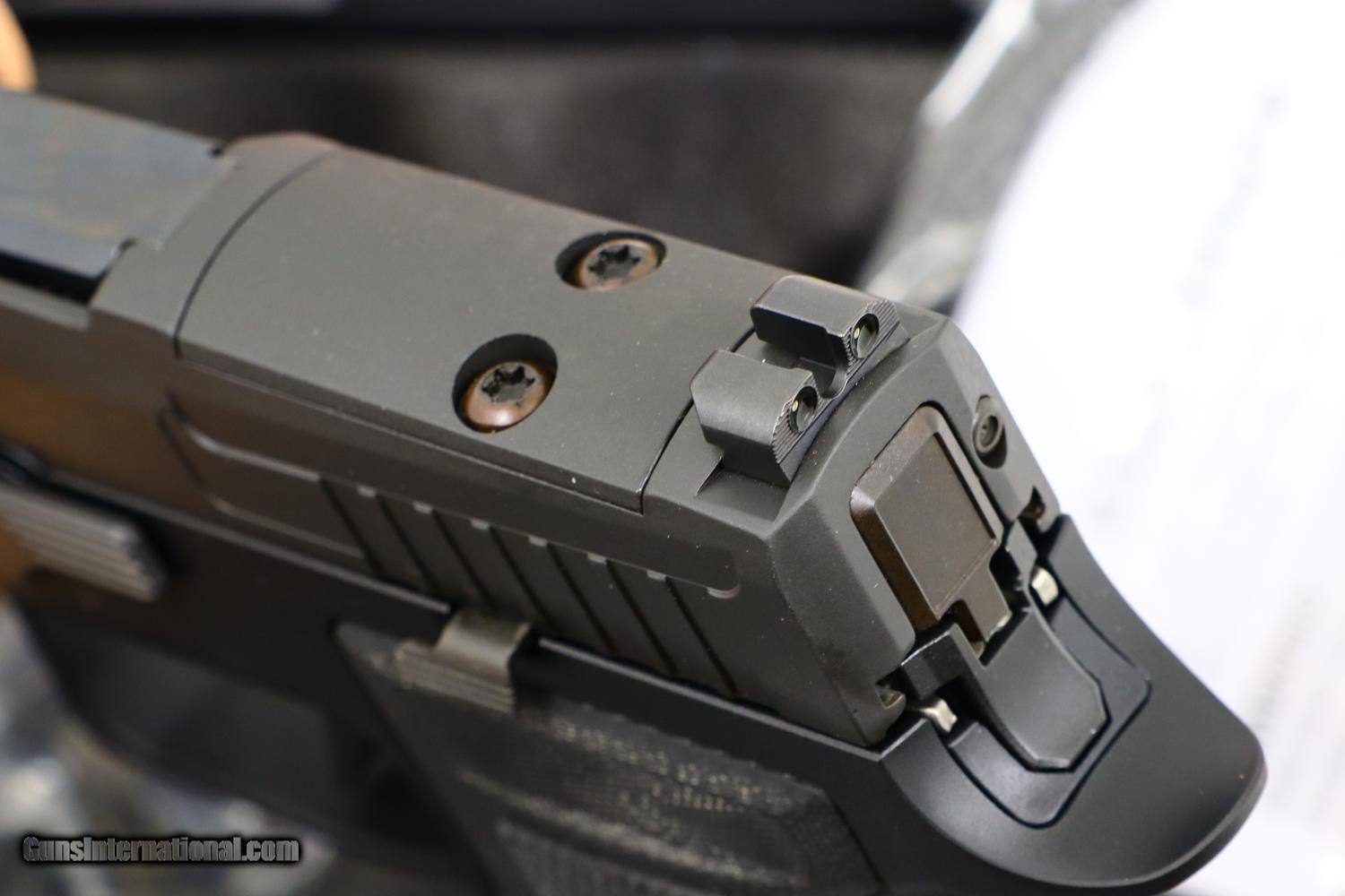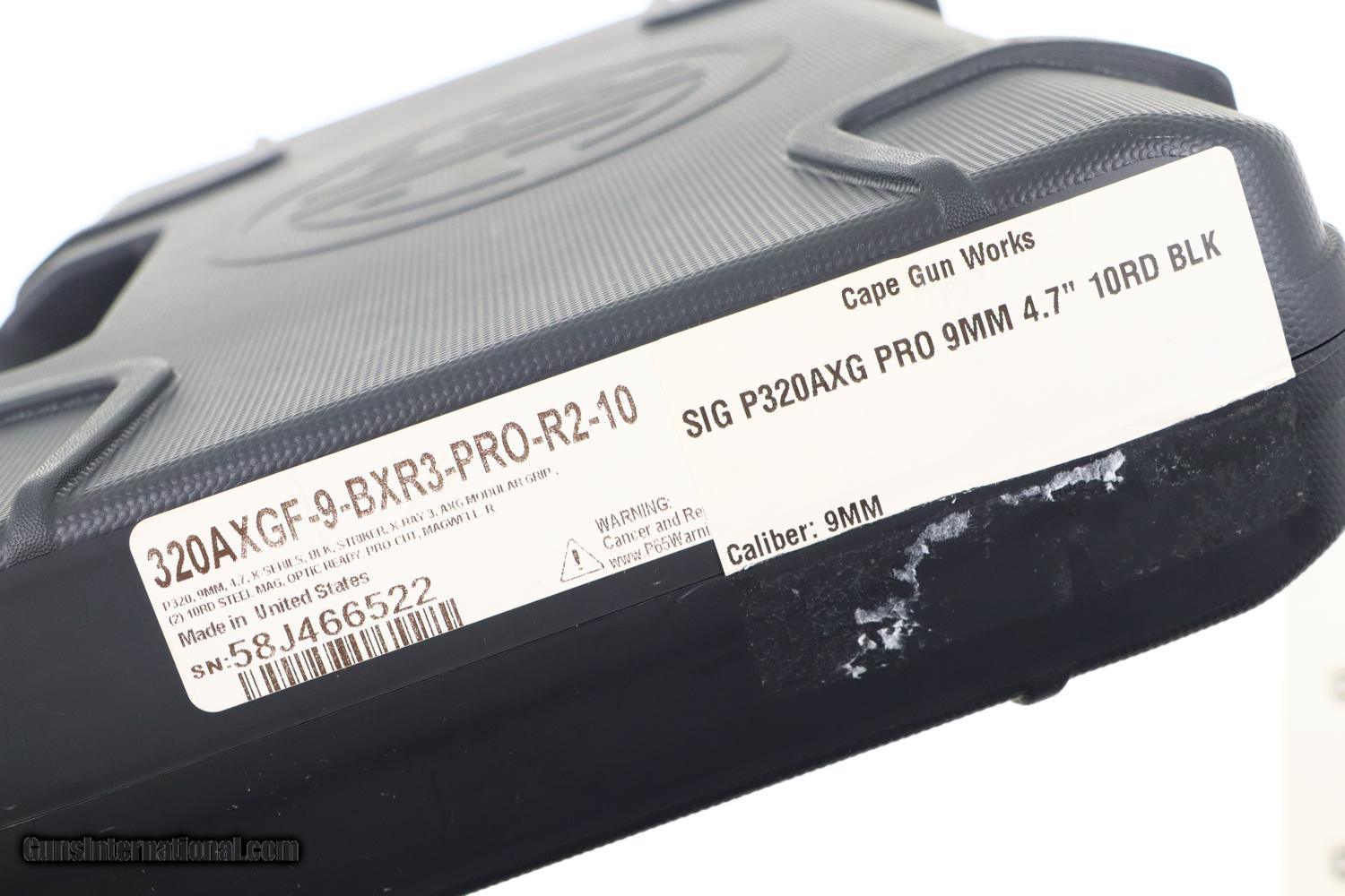 Description: Synopsis: Sig Sauer, P320, Special Order, 58J466522, A-1909 Description: Sig Sauer, P320, skeletonized slide, special features, 9mmP, with 10-round magazine, spare magazine, hang tag, factory paperwork and matching case. This excellent, virtually new in-the-box pistol, has a skeletonized Nitron coated slide, and anodized AXG grip module with Hogue G10 stocks having a laser etched Sig Sauer logo on each panel. Additional special features include X-Ray 3 day / night sights that still glow brightly, X series straight trigger, optics ready pro cut slide, AXG detachable mag well, ambidextrous slide stop, and accessory rail. Included is the original and matching factory hard case, a spare ten-round magazine, cable lock with a pair of keys, manual, and paperwork. A wonderful, unusual, Sig Sauer. Condition: Virtually new in box. Mirror bore. Perfect Manual Mechanics. ~~Insured shipping fee of $55; most packages shipped using FedEx 2nd Day.~~ SOLD Manufacturer: SIG Sauer Serial Number: 58J466522 Caliber Info: 9mm |