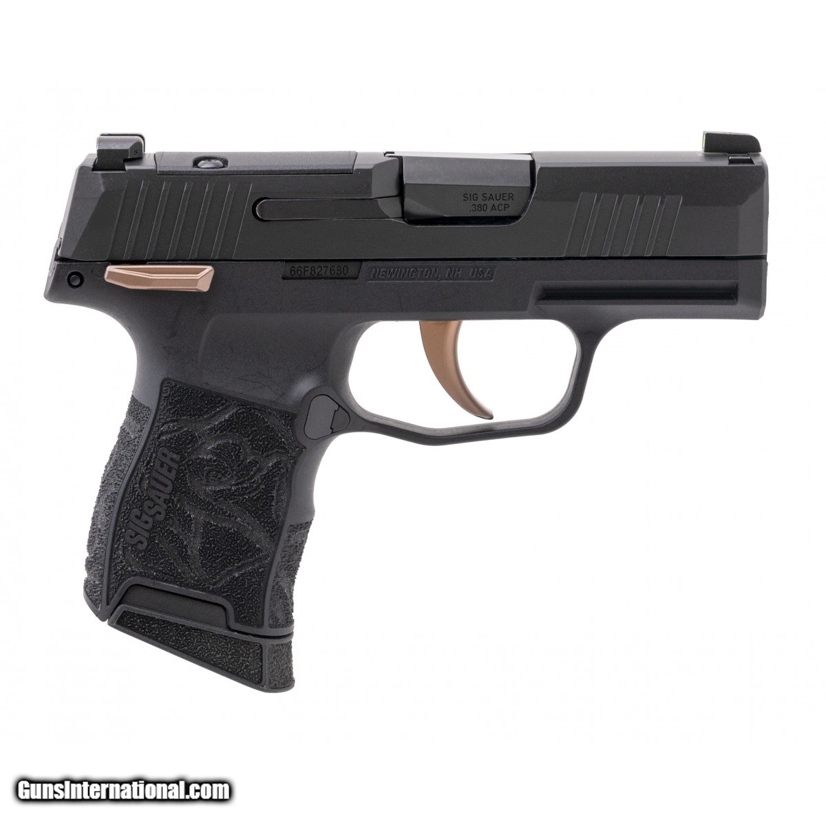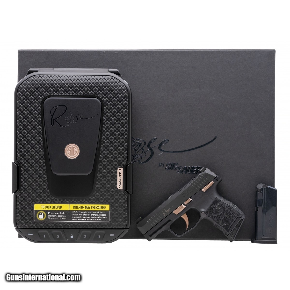 SN: 66F827680. Modern production. .380 with a 3"" barrel. Bore is excellent. Sub-compact, polymer frame pistol. Finish is in excellent condition with rose gold accents. Grips have rose pattern stippling. Pistol comes with box, extra magazine, 5 snap caps, and a Sig Rose Vaultek safe. Overall excellent condition.