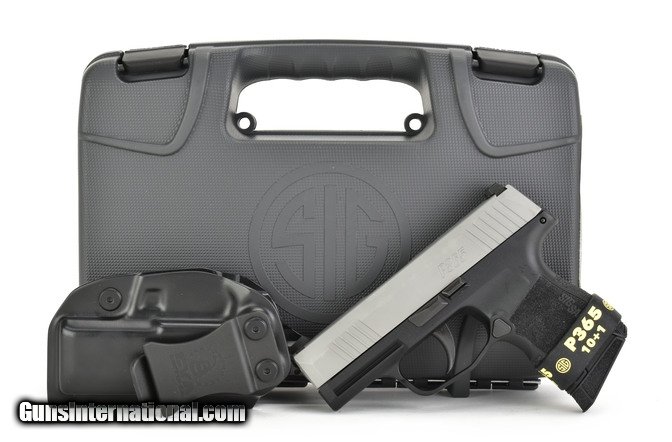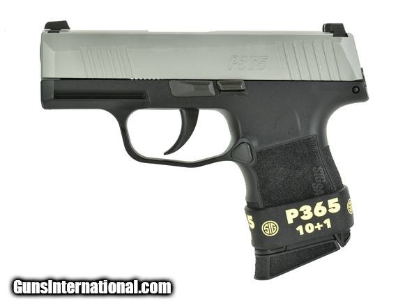 Sig Sauer P365 9mm caliber pistol. Subcompact carry gun with two-tone finish. Excellent condition with box and holster.