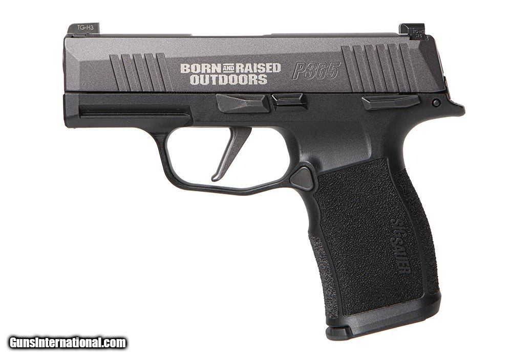 Description: Guns Listing ID: 555055 In collaboration with Born and Raised Outdoors, SIG SAUER has designed a backcountry-equipped version of the best-selling P365. Whether it’s archery, hiking or fishing that gets you in the backcountry, the Born and Raised P365 is designed to be simple, light and compact for easy carry while in the outdoors. Featuring Xray3 day/night sights for low light usage, a Cerakote carbon finish with an engraved Born and Raised Outdoors logo and a flat blade trigger, the Born and Raised Outdoors edition P365 is the perfect companion for outdoor adventures - CALIBER 9MM - MAGAZINE (2) 12rd capacity - BARREL 3.1\" - SIGHTS Xray3 day/night - TRIGGER Flat - GRIPS Polymer SOLD Manufacturer: SIG SAUER Model: P365X BORN AND RAISED Caliber Info: 9MM LUGER (9X19 PARA) Condition: new Barrels: 3.1" BARREL Finish: BLACK CERAKOTE |