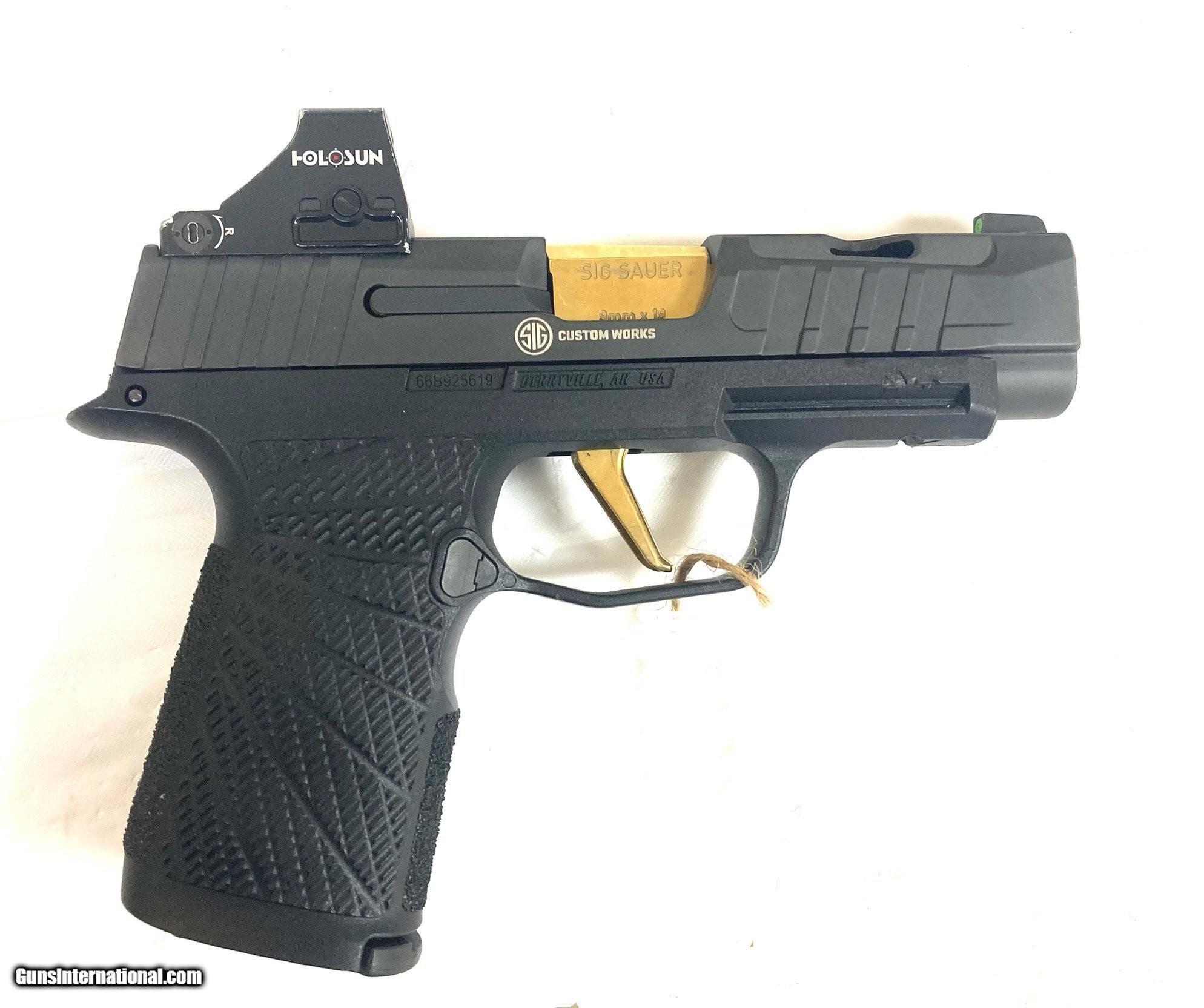 Description: Guns Listing ID: 549733 scuffs on the light/barrel also a notch and some scuffs marks on the front lower plastic comes with 4 mags 2 holsters, original grip along with Wilson combat grip Manufacturer: Sig Sauer Product Line: Sig Custom Works P365 XL Spectre Action: Semi Automatic Caliber: 9mm Barrel Length: 3.1\" Overall Length: 6.6\" Width: 1.1\" Capacity: 12 Weight: 20.7 oz Finish: Black/Gold Features The P365XL Spectre Comp brings an exciting new technology to America’s #1 selling micro-compact pistol with a new Custom Works designed slide that features an integrated compensator reducing muzzle flip and felt recoil by up to 30%. The Spectre family of pistols has become the pinnacle of feature-rich performance in the Sig Custom Works polymer lineup. With exclusive laser stippled grip modules, Titanium Nitride gold barrels and triggers, and custom-designed slides, these exclusive firearms are as functional as they are beautiful. Every Spectre series pistol comes standard with XRay3 day/night sights, flat XSeries triggers, and is optic ready out of the box. Each model also comes standard with two magazines, a Sig Custom Works coin and a certified custom certificate. The P365XL Spectre Comp features an XSeries LXG laser stippled grip module, and a Custom Works slide exclusive to this model, with updated cocking serrations giving the pistol a unique look with theTitanium Nitride gold barrel and trigger. But what makes the Spectre Comp truly stand out is its integrated compensator. Not only does it reduce muzzle flip by nearly 30%, but it also can never come loose or cause function issues, because of its uniquely integrated construction with the slide. In addition, with an optic-ready slide and rear dovetail sight, an installed new Romeo Zero Elite optic can be co-witnessed with suppressor height sights. The P365XL Spectre Comp offers all the benefits of a compensated pistol in a reliable, concealable, everyday carry package. Integrated compensator Laser Stippled LXG XSeries grip module Custom Works Spectre optic-ready slide Titanium Nitride gold barrel and XSeries flat trigger Compatible with all 365XL holsters XRay3 Day/Night sights SOLD Manufacturer: SIG SAUER Model: P365XL SPECTRE COMP Caliber Info: 9MM LUGER (9x19 PARA) Condition: Used - Non-Certified Barrels: 3.1 BARREL Action: SEMI AUTOMATIC Finish: black-and-gold |