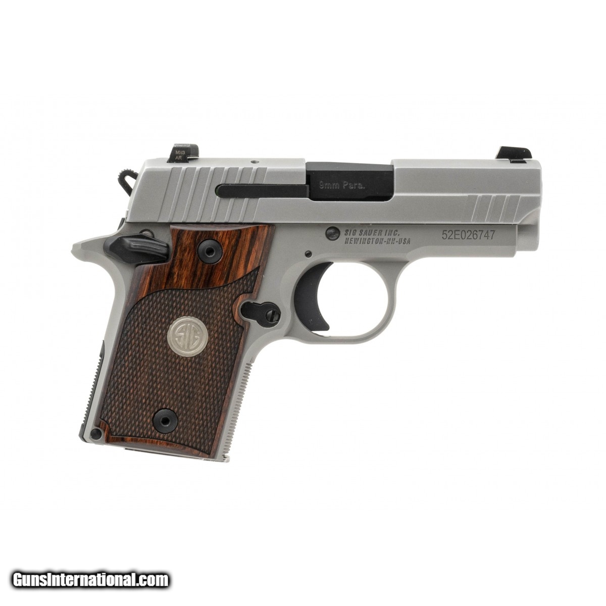 Description: " Hammer-fired pocket pistol, with Alloy frame and stainless PVD finish. Has SIG marked walnut grips. Ambidextrous safety and SIGLITE night sights. Overall excellent condition. Comes with box and extra magazine. SOLD |