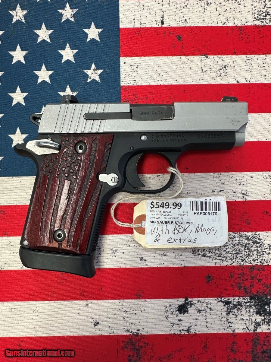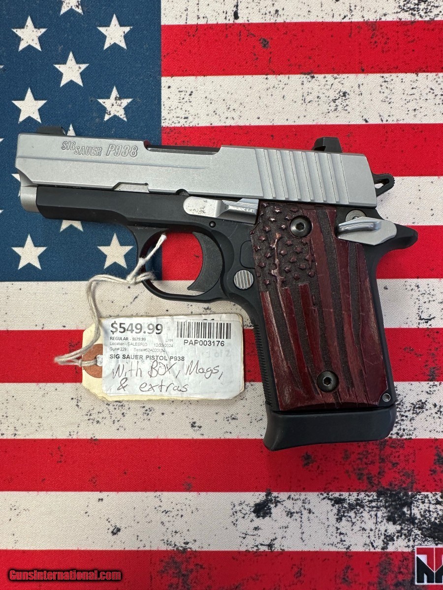 Description: Guns Listing ID: 603958 PISTOL: SIG SAUER MODEL P938, SERIAL NUMBER 52A020134, 2- TONE, YES - INCLUDES ORIGINAL BOX AND PAPERS, 3.2, 9X19MM, SEMI - AUTOMATIC Manufacturer: SIG SAUER Model: P938 Caliber Info: 9MM LUGER (9x19 PARA) Condition: Used - Non-Certified Barrels: 3.2" BARREL Action: SEMI AUTOMATIC Finish: 2- Tone Price: $499.99 Contact Seller |