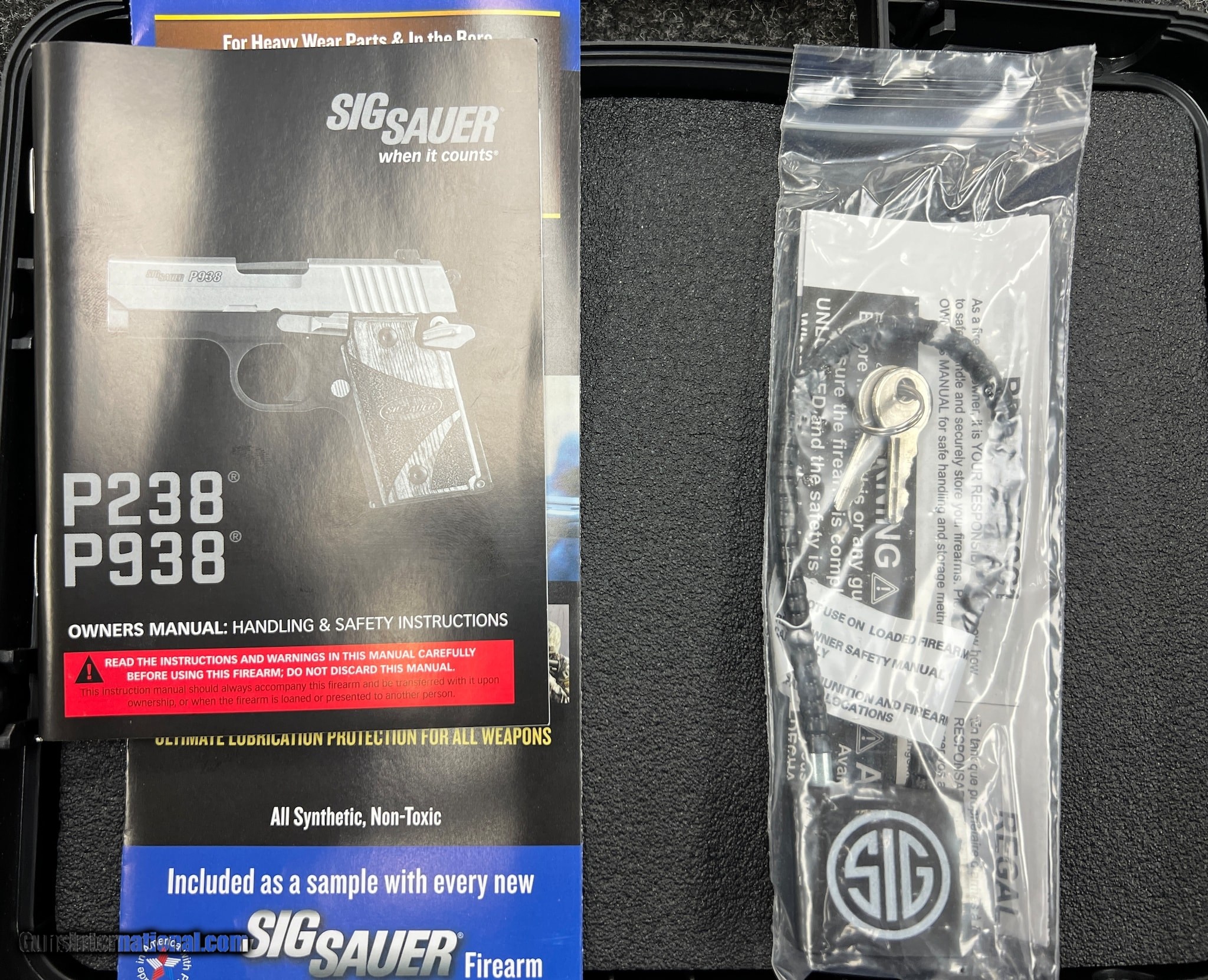 Description: Guns Listing ID: 380939 Sig Sauer pistols are engineered to perform anywhere, at any time, and under any circumstance. They boast unique, advanced features that stand out among the rest. The P938 Micro-Compact is inspired by the P238, is easy to conceal and even easier to shoot. It features an all-metal frame and longer slide and barrel. The cocked-and-locked single-action trigger gives the P938 unmatched accuracy, while the ambidextrous safety makes it easy for left- and right-handed shooters. This model has an aluminum alloy frame with a black hardcoat anodized finish, stainless steel slide with a black nitron finish, contrast sights, black polymer grip. ITEM WAS PUT IN THE SAFE, IT SEEMS IT WAS NEVER FIRED *******INCLUDES********* TWO 7 ROUND MAGAZINES ONE 6 ROUND MAGAZINE HOLSTER PAPER WORKS IN ORIGINAL BOX SOLD Manufacturer: SIG SAUER Model: P938 BLACKWOOD TWO 7 ROUND, ONE 6 ROUND MAGAZINE w/night sights Caliber Info: 9 MM Condition: Used - Non-Certified Barrels: 3 BARREL Finish: STAINLESS AND BLACK |