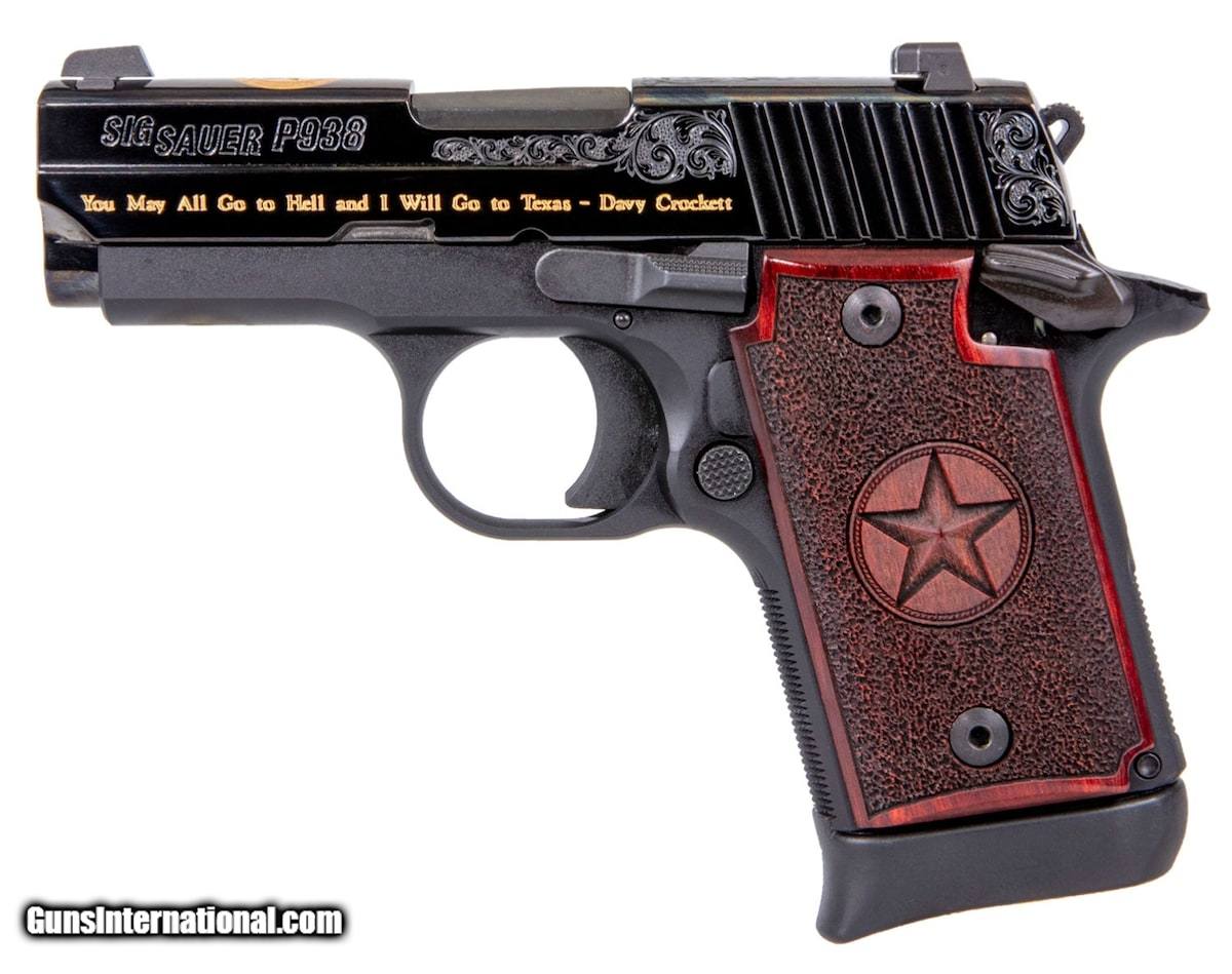 Description: Guns Listing ID: 477507 Sig Sauer‚‚s 938 Engraved Texas edition features scrolled engraving on a polished Nitron slide with gold accents and custom Texas redwood grips emblazened with the Texas star. The top of the slide has an engraved Texas state seal, with \"LONE STAR STATE\" on one side, and \"You may all go to hell and I will go to Texas.\" Davy Crockett on the other side SOLD Manufacturer: SIG SAUER Model: P938 TEXAS ENGRAVED GOLD SAO Caliber Info: 9MM Condition: new Barrels: 3" BARREL |