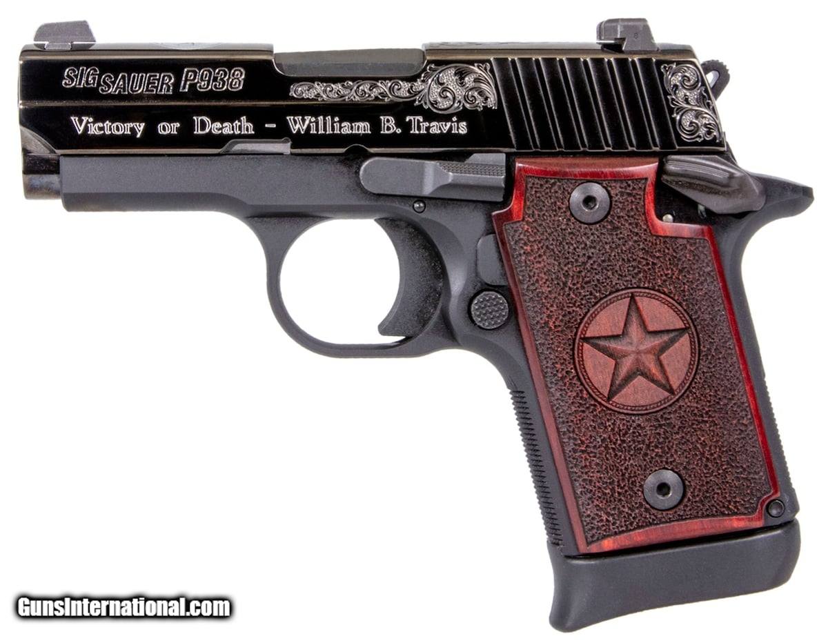 Description: Guns Listing ID: 747471 Sig Sauer‚‚s 938 Engraved Texas edition features scrolled engraving on a polished Nitron slide with silver accents and custom Texas redwood grips emblazened with the Texas star. The top of the slide has an engraved Texas state seal, with \"LONE STAR STATE\" on one side, and \"Victory or Death\" William B. Travis on the other side SOLD Manufacturer: SIG SAUER Model: P938 TEXAS ENGRAVED SILVER Caliber Info: 9MM LUGER (9X19 PARA) Condition: new Barrels: 3 BARREL |