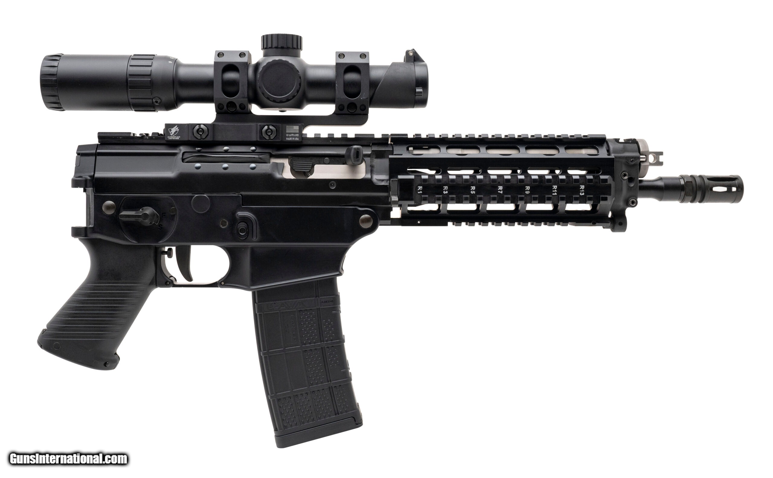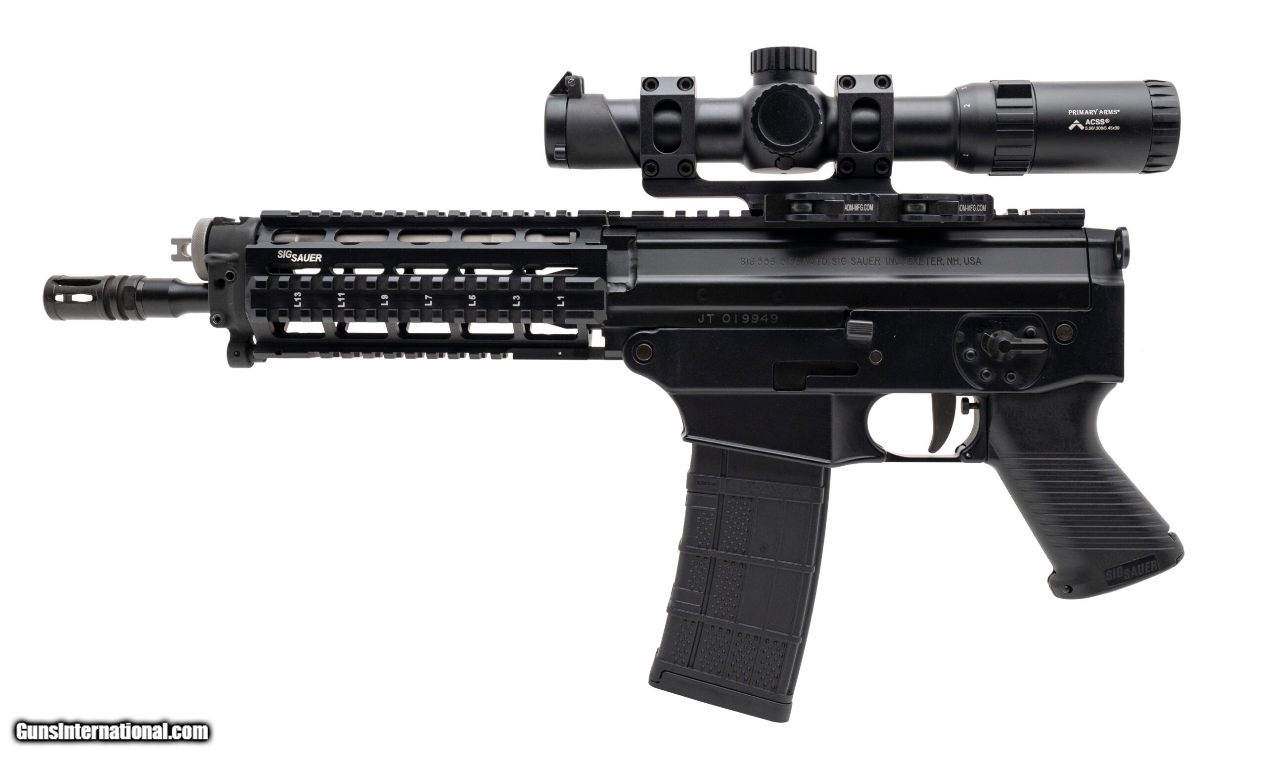 Description: "SN: JT019949. Modern production, 5.56 NATO with a 9.5"" barrel w/ flash hider. Bore is in very good condition. Semi-auto tactical pistol equipped with Sig Sauer picatinny rail handguard and Primary Arms ACSS scope. Finish and grip is in very good condition. Comes with case and back up iron sights. SOLD |