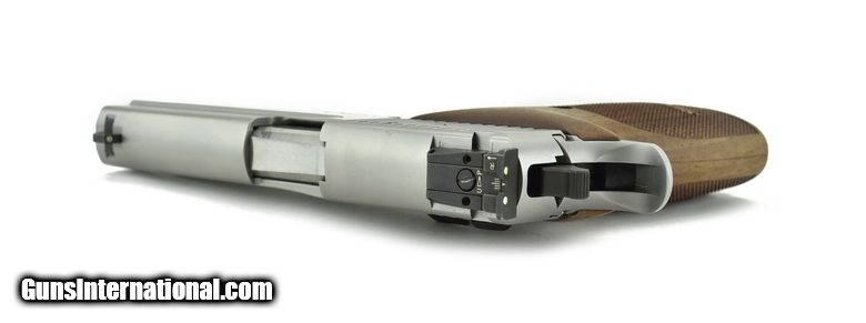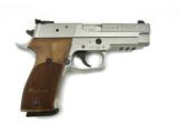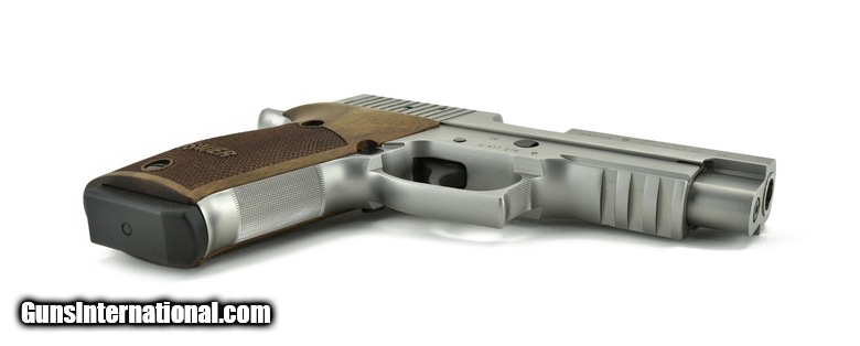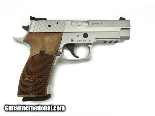 Sig Sauer P220 Sport Stock .45ACP caliber pistol. Scarce and desirable Sport Stock target model German made, all stainless, with wood grips. Excellent condition.