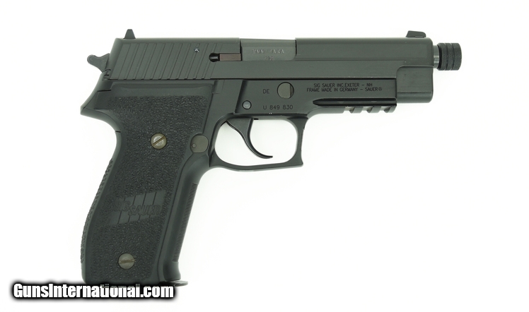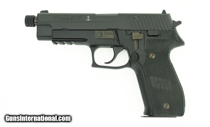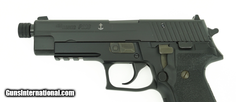 Sig Sauer P226 9mm caliber pistol. Navy tactical model with threaded barrel and anchor mark on slide. Excellent condition.