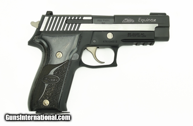 Description: Sig Sauer P226 Equinox 9mm caliber pistol. Equinox model with dark wood grips, SRT, night sights, box, and extra magazine in excellent condition. SOLD |