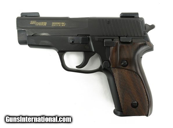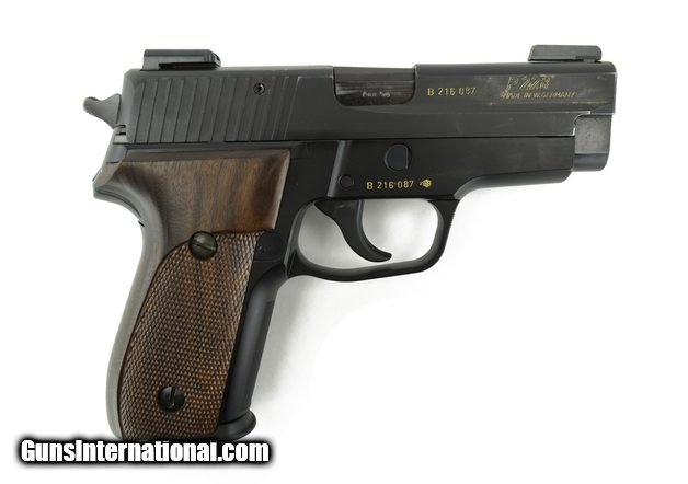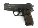 Sig Sauer P228 9mm caliber pistol. West German made with fiber optic night sights and custom wood grips in excellent condition.